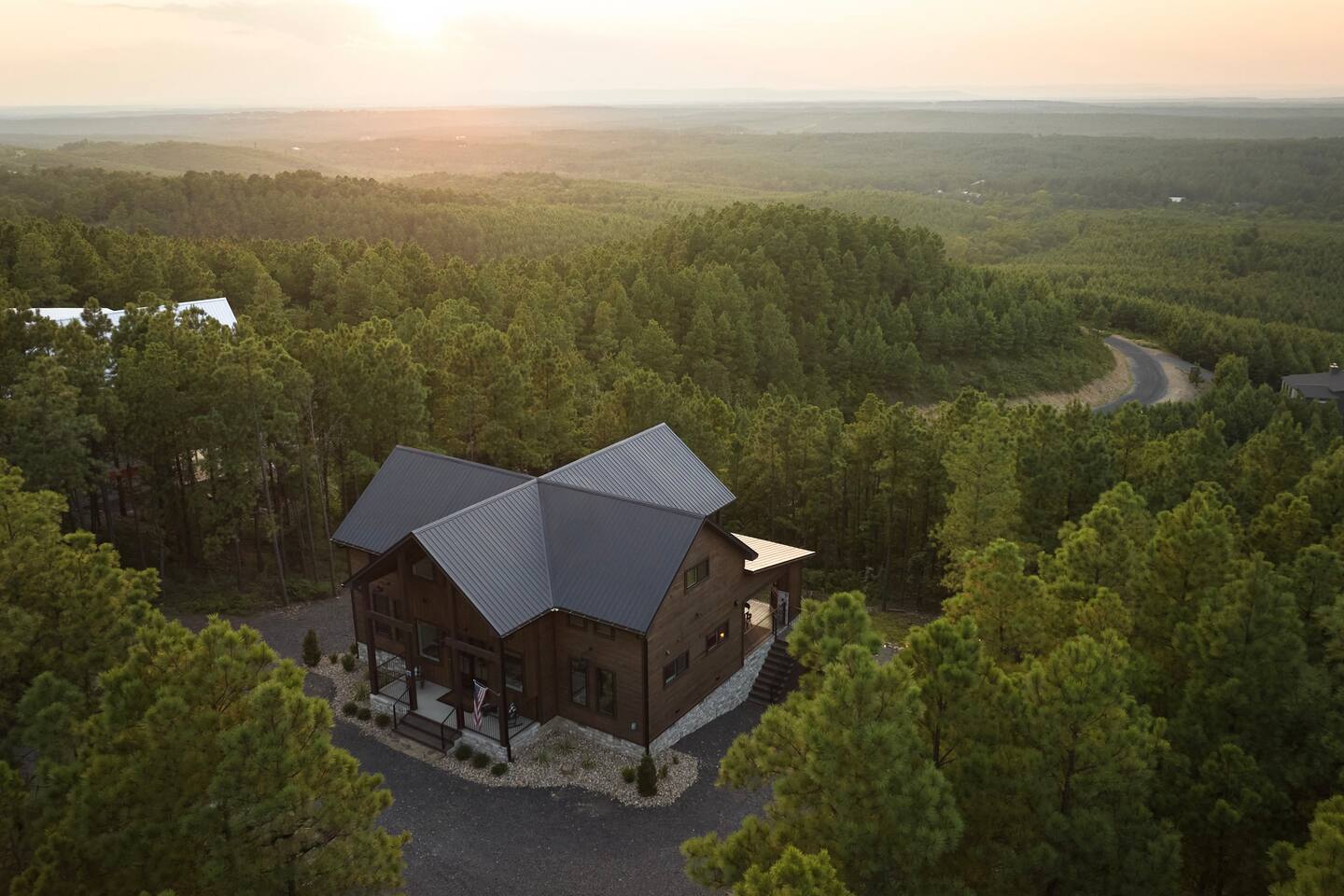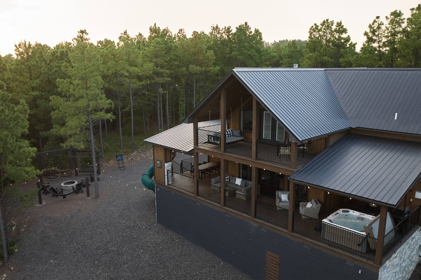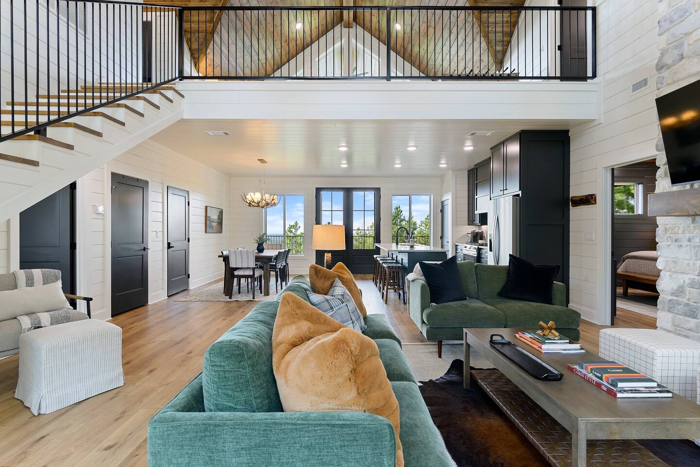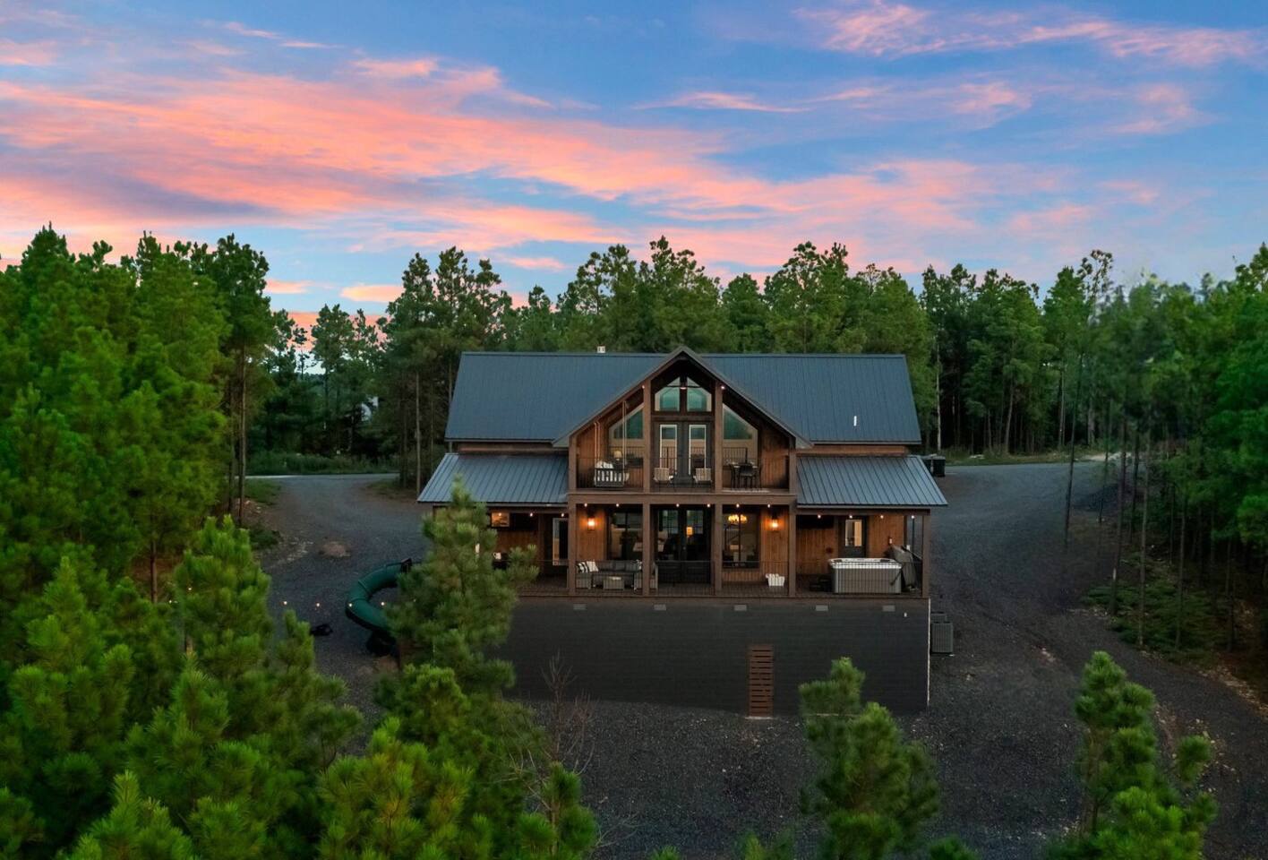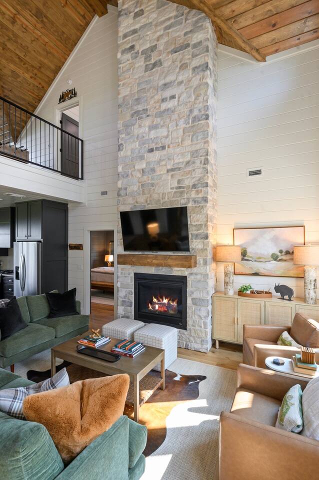 SLEEPING ACCOMODATIONS MAIN LEVEL: KING SUITE #1 •Luxury king bed with memory foam mattress and topper •400 count sheets with several pillow options •Two nightstands with lamps •6-speed ceiling fan with light •50” Roku Smart TV •Barn door offers privacy for a luxury glass enclosed wet room with large soaking tub •Wet room includes large shower with double shower heads, handheld sprayer & teak bench •72” vanity with double sinks, Quartz countertops and full mirror •Luxury bath linens and make-up cloths •Wardrobe valet with hanging rack for storage •Direct access to deck, outdoor fireplace & hot tub with gorgeous mountain views KING SUITE #2 •Luxury king bed with memory foam mattress and topper •400 count sheets with several pillow options •Two nightstands with lamps •6-speed ceiling fan with light •50” Roku Smart TV •Barn door privacy for walk in shower, shower head plus handheld sprayer & teak bench •65” vanity with double sinks with Quartz countertops and full mirror •Luxury bath linens and make-up cloths •Wardrobe valet with hanging rack for storage •Direct access to deck, hot tub and outdoor fireplace with spectacular mountain views UPSTAIRS BUNK ROOM AND FULL BATHROOM •2 queen memory foam beds with wall reading lights and USB chargers •2 twin memory foam bunk beds with stairway access and reading lights /USB chargers •50” Roku Smart TV •6-speed ceiling fan with light •70” loveseat •60” vanity with double sinks, Quartz countertops and full mirror •Tub/shower combination with glass enclosure •Wardrobe valet with hanging rack for storage COMMON AREAS: FAMILY ROOM •Floor to ceiling stone fireplace with gas logs •Stunning Vaulted Ceilings •55” Roku Smart TV •Large 6-speed ceiling fan •Spacious living area with a sofa, loveseat, two swivel chairs and two ottomans •Coffee table includes local interest books •Cabinet with games, books and puzzles •Chair and footstool under stairs for additional seating DINING ROOM AND KITCHEN •Large windows and doors provide relaxing mountain views for family dining experiences •Large rectangular wooden table with seating for 8 •Island bar area with seating for 4 guests •Deluxe 5 burner gas range •Deluxe refrigerator with water and ice in the door •Keurig K-Duo coffee maker with K-Cup and drip coffee pot. Includes 6 K-cups and ground coffee •Insta-pot/crockpot, toaster, blender and microwave •Dinnerware, glassware and silverware for 12 •3 serving platters and 2 serving bowls •Full array of bakeware, cookware and utensils including cutting boards and strainers •Kitchen towels, potholders, and hot pads/trivets •Full size stacked front load washer and dryer in laundry closet includes 5 laundry pods, broom, mop, dustpan, iron and small ironing board. UPSTAIRS LOFT GAMEROOM AREA •Large windows and doors provide majestic mountain views •Large 6-speed ceiling fan •Sofa, accent chair, coffee table and 50” Roku TV •Foosball table •2 Swivel chairs with ottomans to enjoy the view! •Cabinet with additional games, children’s books and puzzles OUTDOOR LIVING ON MAIN DECK •Expansive covered deck on main level •7-person deluxe HotSpring hot tub with 40 jets and LED lights for ultimate relaxation •Stone fireplace with gas logs •Two 50” Roku Smart TV’s and two 6-speed ceiling fans •Outdoor ambient string lighting on deck and connecting to firepit •Napoleon 4 burner BBQ gas grill with shelves and grill utensils •Outdoor patio table with seating for 8 •Sectional sofa and 2 club chairs •Wicker bar with two barstools and towels conveniently located near hot tub •Access to firepit area from deck stairs with child safety gate •Slide from main level deck to firepit with child safety gate on deck UPPER DECK •Majestic mountain view for watching sunrises and sunsets •Luxury daybed with lots of comfy pillows enhances stunning sunset views •6-speed ceiling fan •Table and 2 chairs for a workstation with a view or for games and puzzles, etc •Workout basket including yoga mat, foam roller & 5 lb. dumbbells for a workout with a view OUTDOOR ACTIVITY AREA •Stone firepit with six Adirondack chairs surrounded by ambient string lights •Perfect for s’mores, stories and stargazing loaded with fun family bonding and laughter •Firepit includes 5 posts with relaxing 60” swing, 2 saucer swings and hammock •Fully enclosed slide from back deck to firepit area •Outdoor cornhole game FRONT PORCH •Two step front entrance with handrails for easy unloading and loading •Front double doors provide your first glimpse of Mountain Ridge Retreat •Front porch with two comfortable rocking chairs for relaxing and enjoying the cabin •EV outlet available (Bring your own charger) •Ample parking in circle driveway for up to 5 vehicles and boat trailer parking Our cabin is professionally designed by KariLynn Interiors based out of Austin, TX.