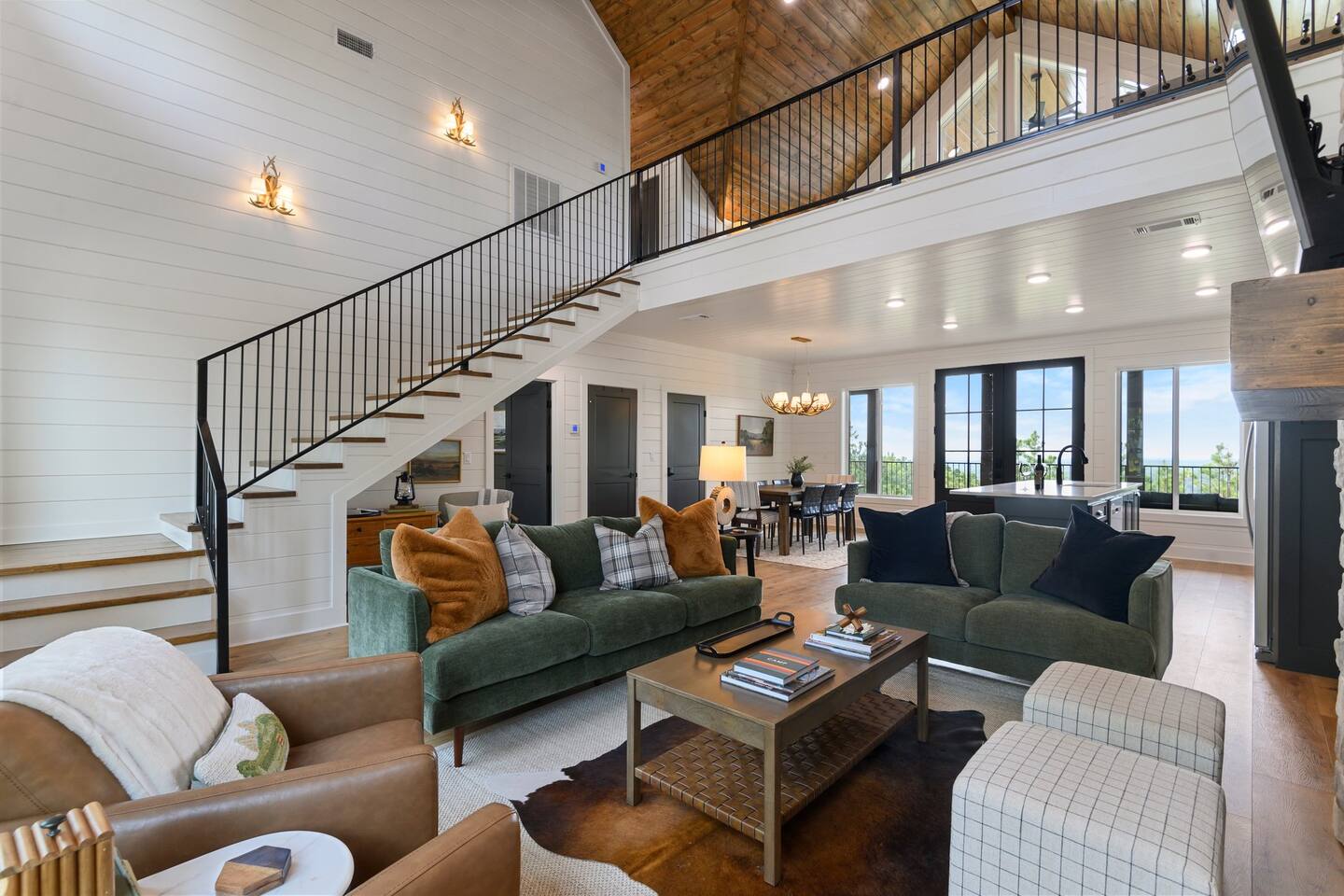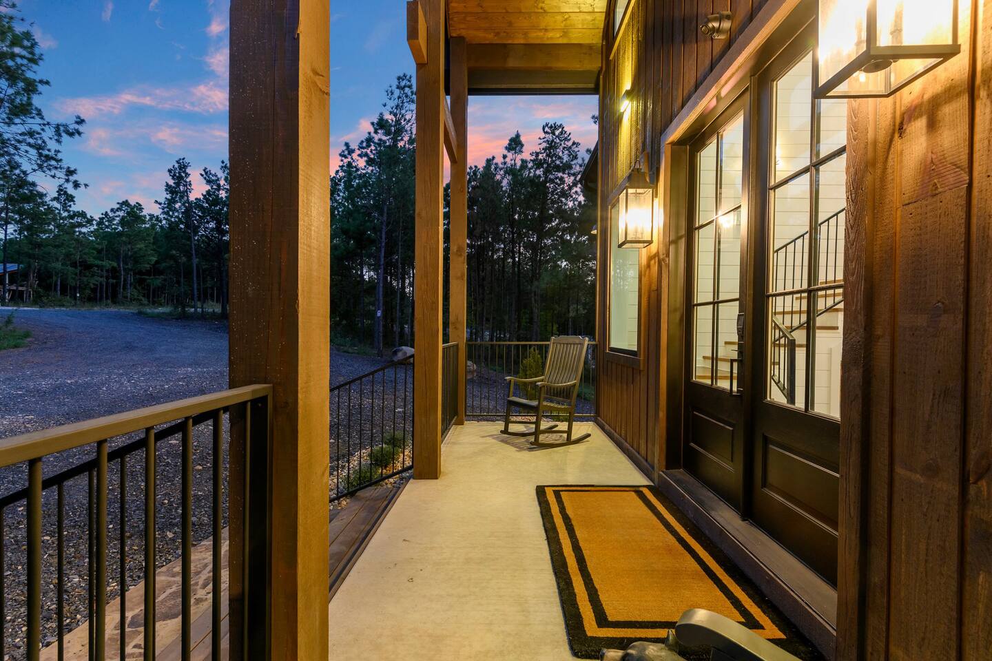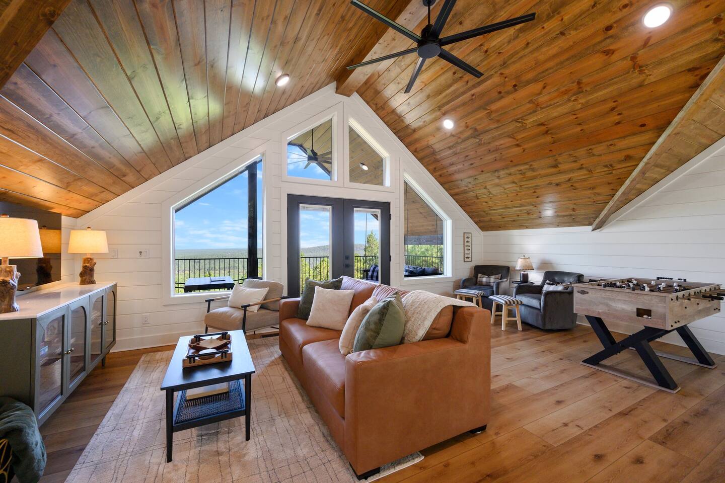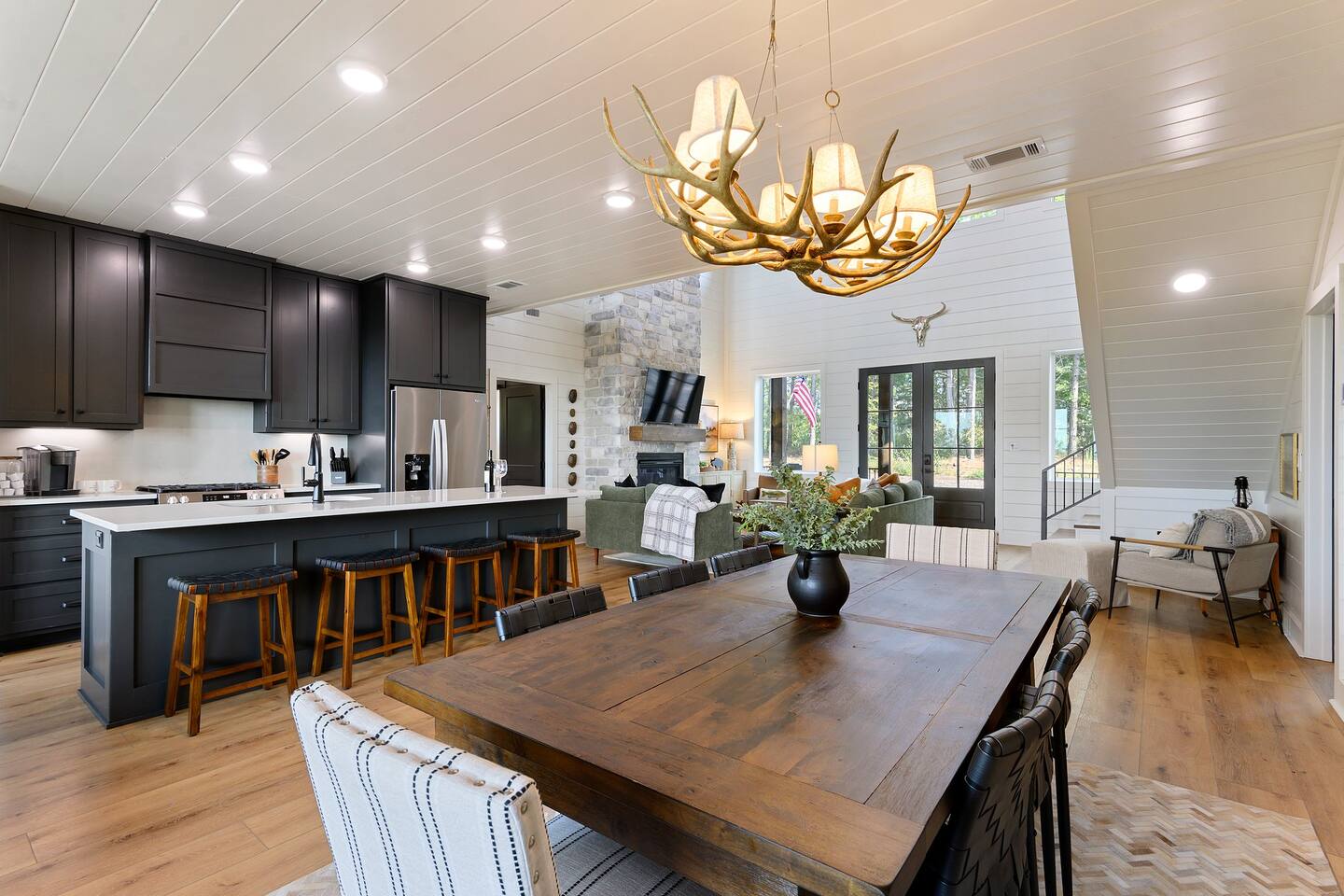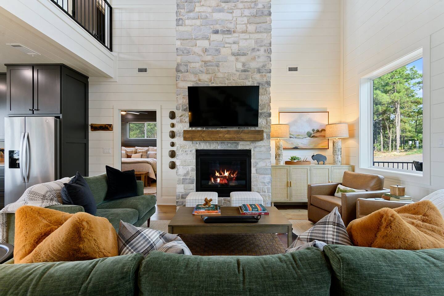 SLEEPING ACCOMODATIONS MAIN LEVEL: KING SUITE #1 •Luxury king bed with memory foam mattress and topper •400 count sheets with several pillow options •Two nightstands with lamps •6-speed ceiling fan with light •50” Roku Smart TV •Barn door offers privacy for a luxury glass enclosed wet room with large soaking tub •Wet room includes large shower with double shower heads, handheld sprayer & teak bench •72” vanity with double sinks, Quartz countertops and full mirror •Luxury bath linens and make-up cloths •Wardrobe valet with hanging rack for storage •Direct access to deck, outdoor fireplace & hot tub with gorgeous mountain views KING SUITE #2 •Luxury king bed with memory foam mattress and topper •400 count sheets with several pillow options •Two nightstands with lamps •6-speed ceiling fan with light •50” Roku Smart TV •Barn door privacy for walk in shower, shower head plus handheld sprayer & teak bench •65” vanity with double sinks with Quartz countertops and full mirror •Luxury bath linens and make-up cloths •Wardrobe valet with hanging rack for storage •Direct access to deck, hot tub and outdoor fireplace with spectacular mountain views UPSTAIRS BUNK ROOM AND FULL BATHROOM •2 queen memory foam beds with wall reading lights and USB chargers •2 twin memory foam bunk beds with stairway access and reading lights /USB chargers •50” Roku Smart TV •6-speed ceiling fan with light •70” loveseat •60” vanity with double sinks, Quartz countertops and full mirror •Tub/shower combination with glass enclosure •Wardrobe valet with hanging rack for storage COMMON AREAS: FAMILY ROOM •Floor to ceiling stone fireplace with gas logs •Stunning Vaulted Ceilings •55” Roku Smart TV •Large 6-speed ceiling fan •Spacious living area with a sofa, loveseat, two swivel chairs and two ottomans •Coffee table includes local interest books •Cabinet with games, books and puzzles •Chair and footstool under stairs for additional seating DINING ROOM AND KITCHEN •Large windows and doors provide relaxing mountain views for family dining experiences •Large rectangular wooden table with seating for 8 •Island bar area with seating for 4 guests •Deluxe 5 burner gas range •Deluxe refrigerator with water and ice in the door •Keurig K-Duo coffee maker with K-Cup and drip coffee pot. Includes 6 K-cups and ground coffee •Insta-pot/crockpot, toaster, blender and microwave •Dinnerware, glassware and silverware for 12 •3 serving platters and 2 serving bowls •Full array of bakeware, cookware and utensils including cutting boards and strainers •Kitchen towels, potholders, and hot pads/trivets •Full size stacked front load washer and dryer in laundry closet includes 5 laundry pods, broom, mop, dustpan, iron and small ironing board. UPSTAIRS LOFT GAMEROOM AREA •Large windows and doors provide majestic mountain views •Large 6-speed ceiling fan •Sofa, accent chair, coffee table and 50” Roku TV •Foosball table •2 Swivel chairs with ottomans to enjoy the view! •Cabinet with additional games, children’s books and puzzles OUTDOOR LIVING ON MAIN DECK •Expansive covered deck on main level •7-person deluxe HotSpring hot tub with 40 jets and LED lights for ultimate relaxation •Stone fireplace with gas logs •Two 50” Roku Smart TV’s and two 6-speed ceiling fans •Outdoor ambient string lighting on deck and connecting to firepit •Napoleon 4 burner BBQ gas grill with shelves and grill utensils •Outdoor patio table with seating for 8 •Sectional sofa and 2 club chairs •Wicker bar with two barstools and towels conveniently located near hot tub •Access to firepit area from deck stairs with child safety gate •Slide from main level deck to firepit with child safety gate on deck UPPER DECK •Majestic mountain view for watching sunrises and sunsets •Luxury daybed with lots of comfy pillows enhances stunning sunset views •6-speed ceiling fan •Table and 2 chairs for a workstation with a view or for games and puzzles, etc •Workout basket including yoga mat, foam roller & 5 lb. dumbbells for a workout with a view OUTDOOR ACTIVITY AREA •Stone firepit with six Adirondack chairs surrounded by ambient string lights •Perfect for s’mores, stories and stargazing loaded with fun family bonding and laughter •Firepit includes 5 posts with relaxing 60” swing, 2 saucer swings and hammock •Fully enclosed slide from back deck to firepit area •Outdoor cornhole game FRONT PORCH •Two step front entrance with handrails for easy unloading and loading •Front double doors provide your first glimpse of Mountain Ridge Retreat •Front porch with two comfortable rocking chairs for relaxing and enjoying the cabin •EV outlet available (Bring your own charger) •Ample parking in circle driveway for up to 5 vehicles and boat trailer parking Our cabin is professionally designed by KariLynn Interiors based out of Austin, TX.