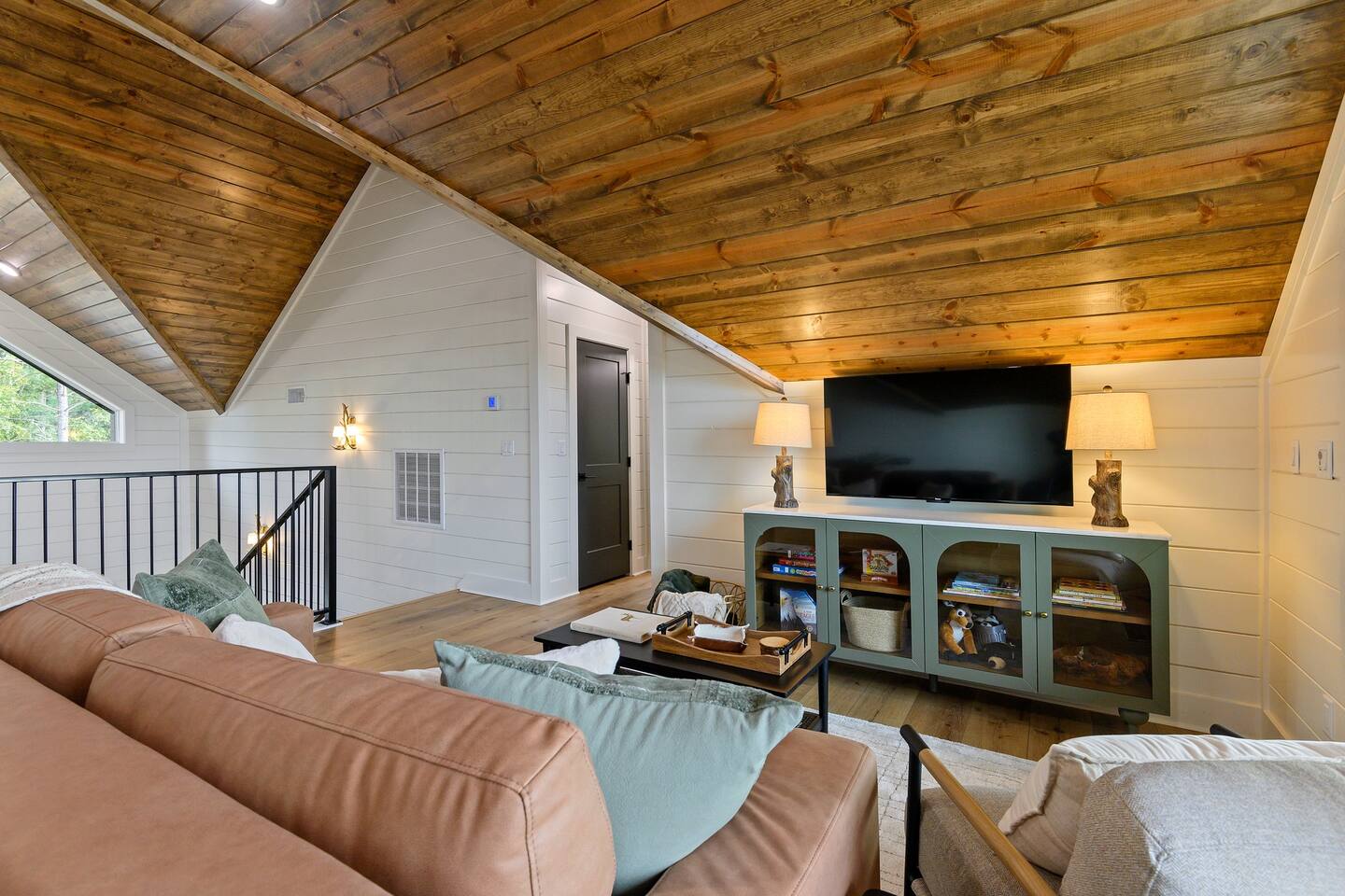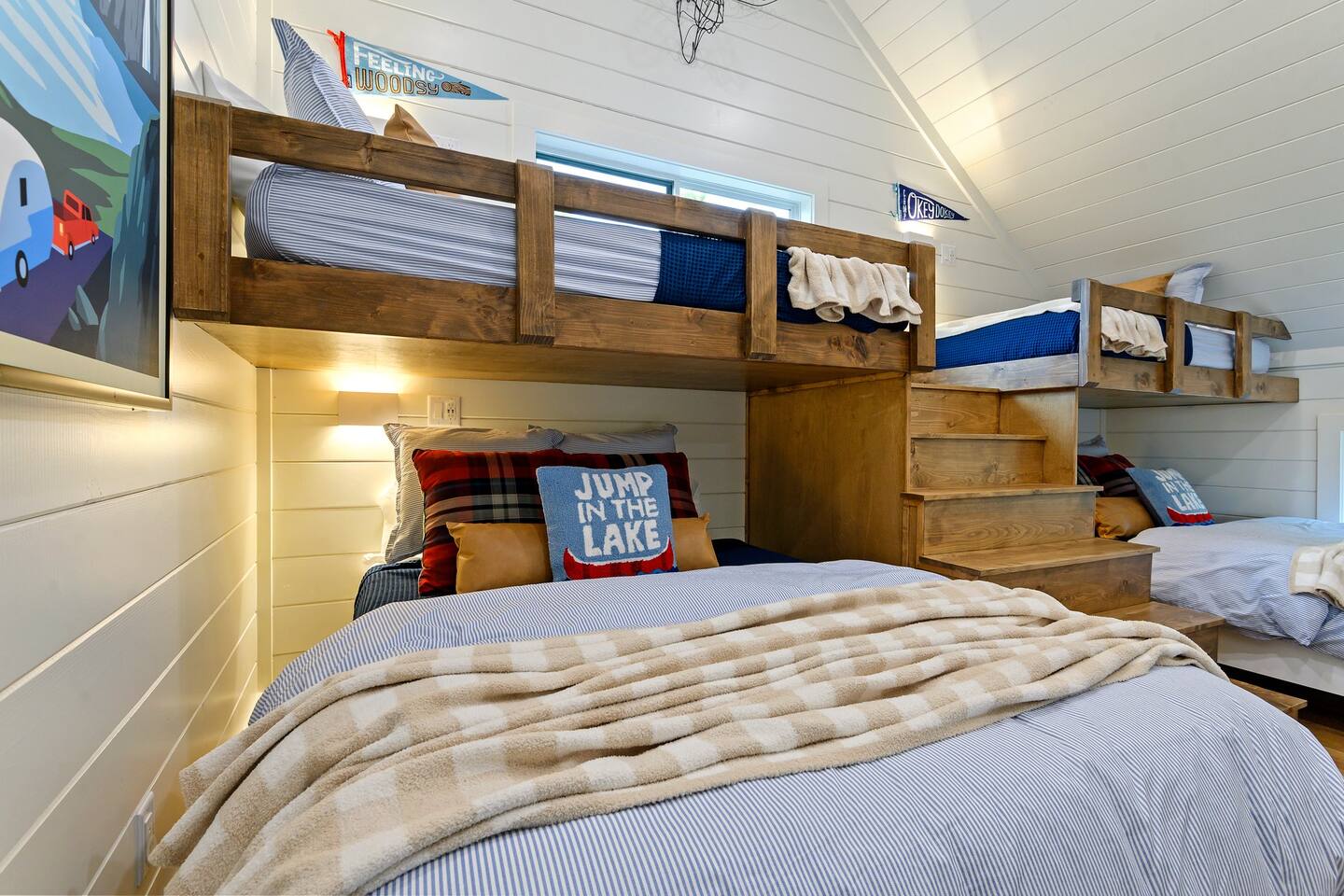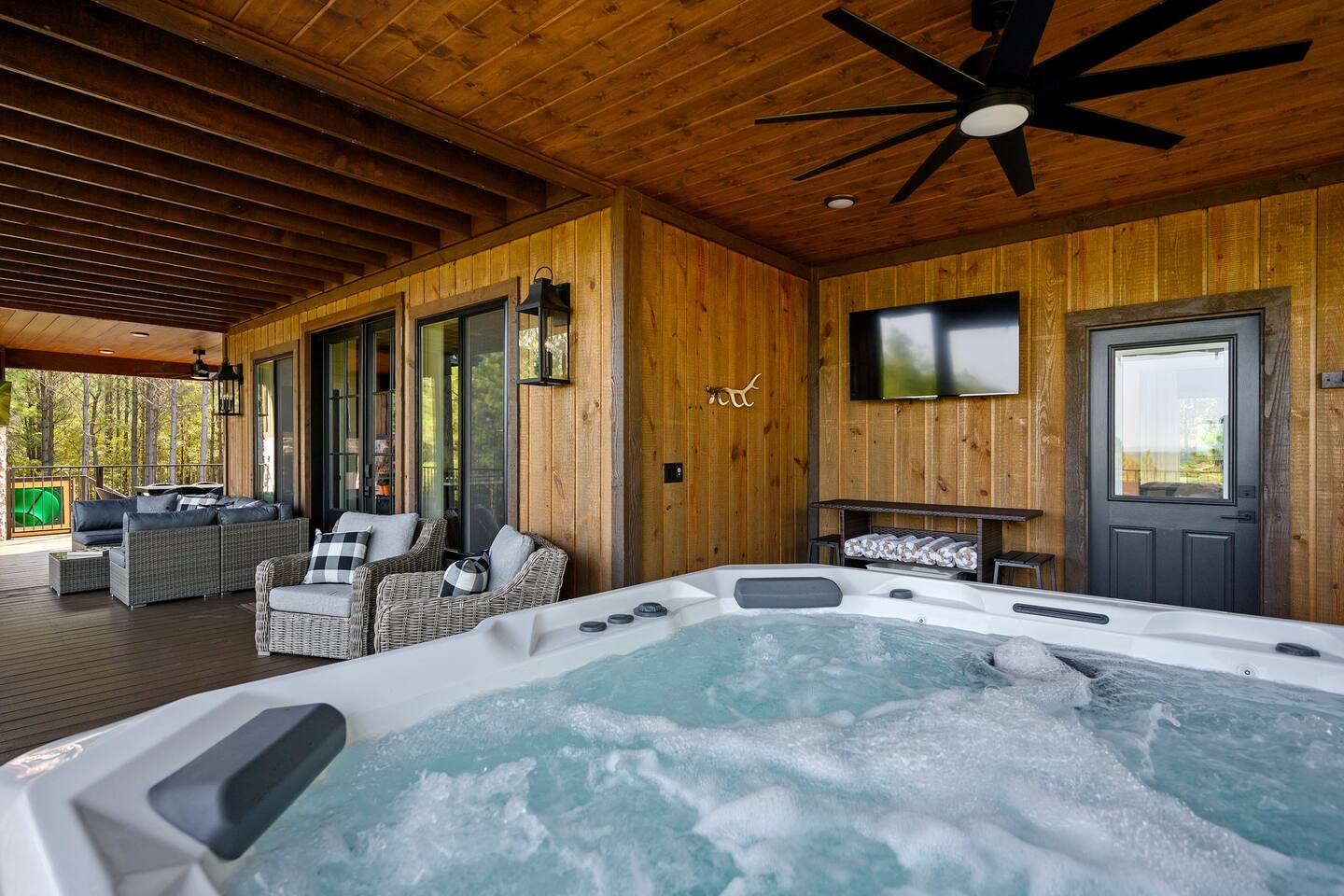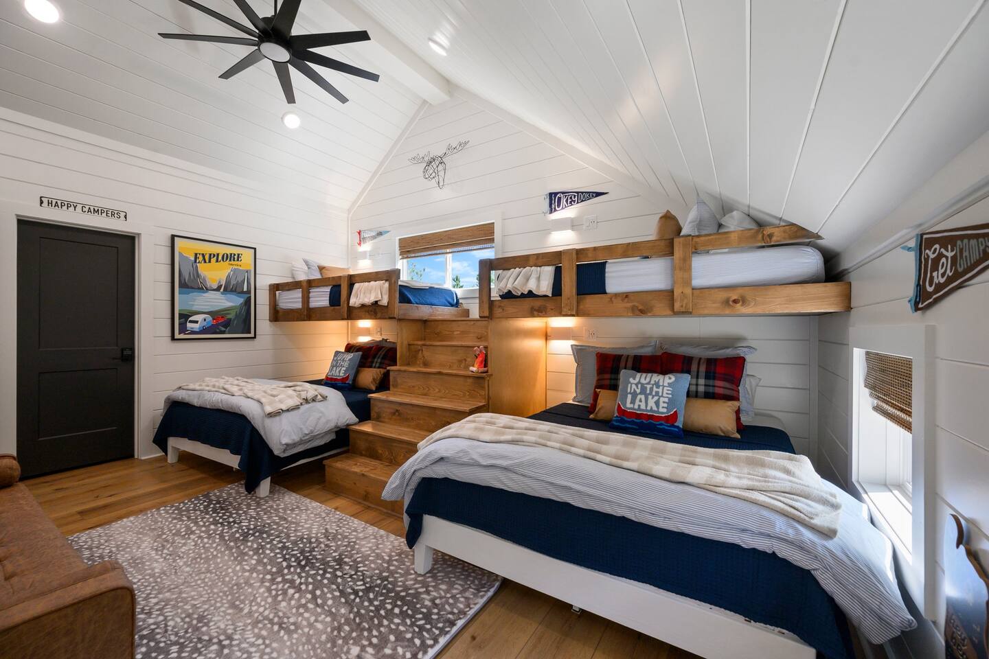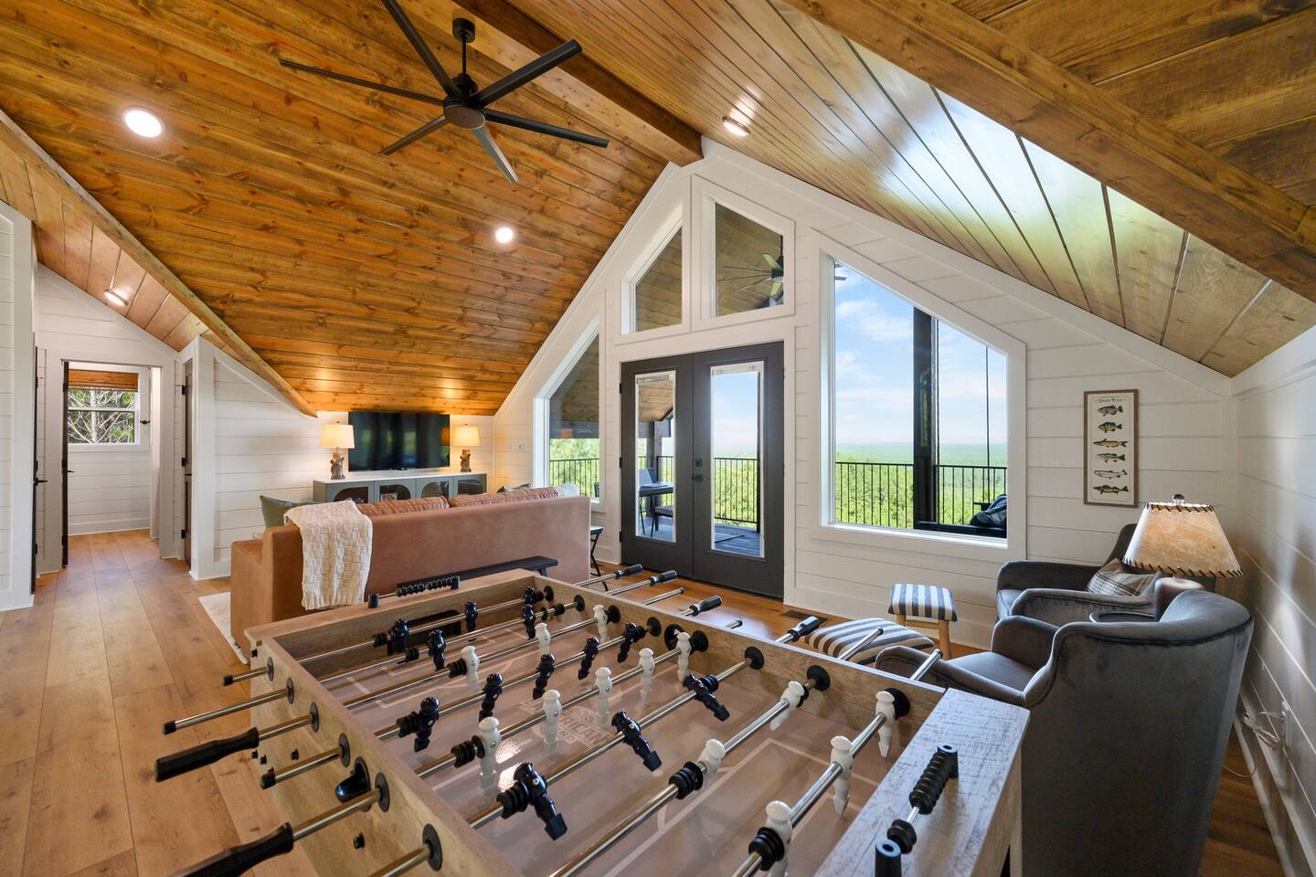 SLEEPING ACCOMODATIONS MAIN LEVEL: KING SUITE #1 •Luxury king bed with memory foam mattress and topper •400 count sheets with several pillow options •Two nightstands with lamps •6-speed ceiling fan with light •50” Roku Smart TV •Barn door offers privacy for a luxury glass enclosed wet room with large soaking tub •Wet room includes large shower with double shower heads, handheld sprayer & teak bench •72” vanity with double sinks, Quartz countertops and full mirror •Luxury bath linens and make-up cloths •Wardrobe valet with hanging rack for storage •Direct access to deck, outdoor fireplace & hot tub with gorgeous mountain views KING SUITE #2 •Luxury king bed with memory foam mattress and topper •400 count sheets with several pillow options •Two nightstands with lamps •6-speed ceiling fan with light •50” Roku Smart TV •Barn door privacy for walk in shower, shower head plus handheld sprayer & teak bench •65” vanity with double sinks with Quartz countertops and full mirror •Luxury bath linens and make-up cloths •Wardrobe valet with hanging rack for storage •Direct access to deck, hot tub and outdoor fireplace with spectacular mountain views UPSTAIRS BUNK ROOM AND FULL BATHROOM •2 queen memory foam beds with wall reading lights and USB chargers •2 twin memory foam bunk beds with stairway access and reading lights /USB chargers •50” Roku Smart TV •6-speed ceiling fan with light •70” loveseat •60” vanity with double sinks, Quartz countertops and full mirror •Tub/shower combination with glass enclosure •Wardrobe valet with hanging rack for storage COMMON AREAS: FAMILY ROOM •Floor to ceiling stone fireplace with gas logs •Stunning Vaulted Ceilings •55” Roku Smart TV •Large 6-speed ceiling fan •Spacious living area with a sofa, loveseat, two swivel chairs and two ottomans •Coffee table includes local interest books •Cabinet with games, books and puzzles •Chair and footstool under stairs for additional seating DINING ROOM AND KITCHEN •Large windows and doors provide relaxing mountain views for family dining experiences •Large rectangular wooden table with seating for 8 •Island bar area with seating for 4 guests •Deluxe 5 burner gas range •Deluxe refrigerator with water and ice in the door •Keurig K-Duo coffee maker with K-Cup and drip coffee pot. Includes 6 K-cups and ground coffee •Insta-pot/crockpot, toaster, blender and microwave •Dinnerware, glassware and silverware for 12 •3 serving platters and 2 serving bowls •Full array of bakeware, cookware and utensils including cutting boards and strainers •Kitchen towels, potholders, and hot pads/trivets •Full size stacked front load washer and dryer in laundry closet includes 5 laundry pods, broom, mop, dustpan, iron and small ironing board. UPSTAIRS LOFT GAMEROOM AREA •Large windows and doors provide majestic mountain views •Large 6-speed ceiling fan •Sofa, accent chair, coffee table and 50” Roku TV •Foosball table •2 Swivel chairs with ottomans to enjoy the view! •Cabinet with additional games, children’s books and puzzles OUTDOOR LIVING ON MAIN DECK •Expansive covered deck on main level •7-person deluxe HotSpring hot tub with 40 jets and LED lights for ultimate relaxation •Stone fireplace with gas logs •Two 50” Roku Smart TV’s and two 6-speed ceiling fans •Outdoor ambient string lighting on deck and connecting to firepit •Napoleon 4 burner BBQ gas grill with shelves and grill utensils •Outdoor patio table with seating for 8 •Sectional sofa and 2 club chairs •Wicker bar with two barstools and towels conveniently located near hot tub •Access to firepit area from deck stairs with child safety gate •Slide from main level deck to firepit with child safety gate on deck UPPER DECK •Majestic mountain view for watching sunrises and sunsets •Luxury daybed with lots of comfy pillows enhances stunning sunset views •6-speed ceiling fan •Table and 2 chairs for a workstation with a view or for games and puzzles, etc •Workout basket including yoga mat, foam roller & 5 lb. dumbbells for a workout with a view OUTDOOR ACTIVITY AREA •Stone firepit with six Adirondack chairs surrounded by ambient string lights •Perfect for s’mores, stories and stargazing loaded with fun family bonding and laughter •Firepit includes 5 posts with relaxing 60” swing, 2 saucer swings and hammock •Fully enclosed slide from back deck to firepit area •Outdoor cornhole game FRONT PORCH •Two step front entrance with handrails for easy unloading and loading •Front double doors provide your first glimpse of Mountain Ridge Retreat •Front porch with two comfortable rocking chairs for relaxing and enjoying the cabin •EV outlet available (Bring your own charger) •Ample parking in circle driveway for up to 5 vehicles and boat trailer parking Our cabin is professionally designed by KariLynn Interiors based out of Austin, TX.