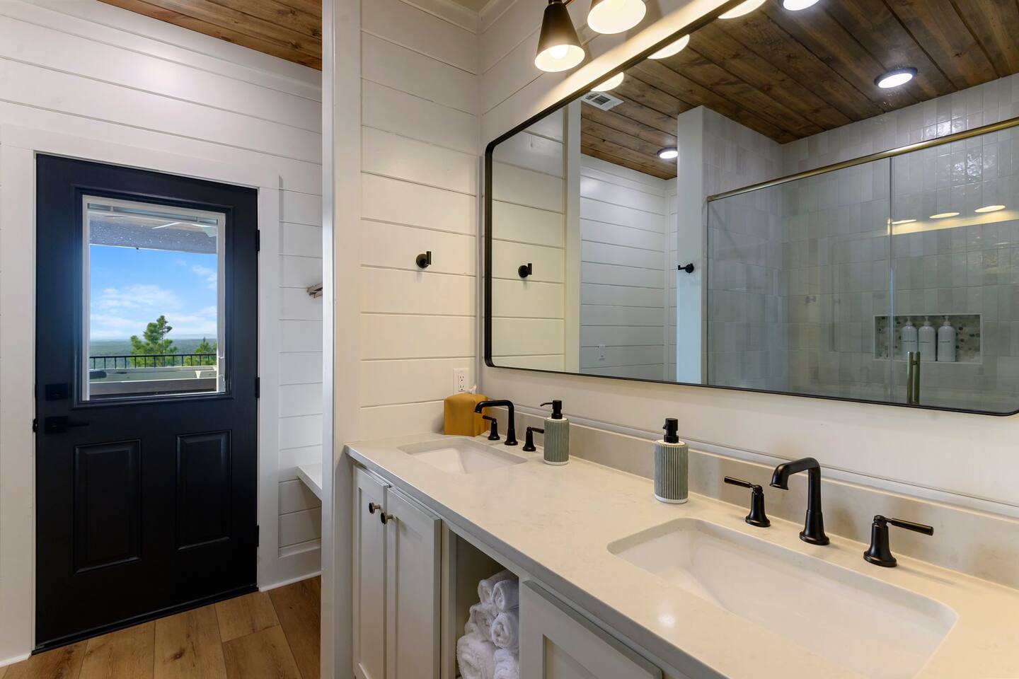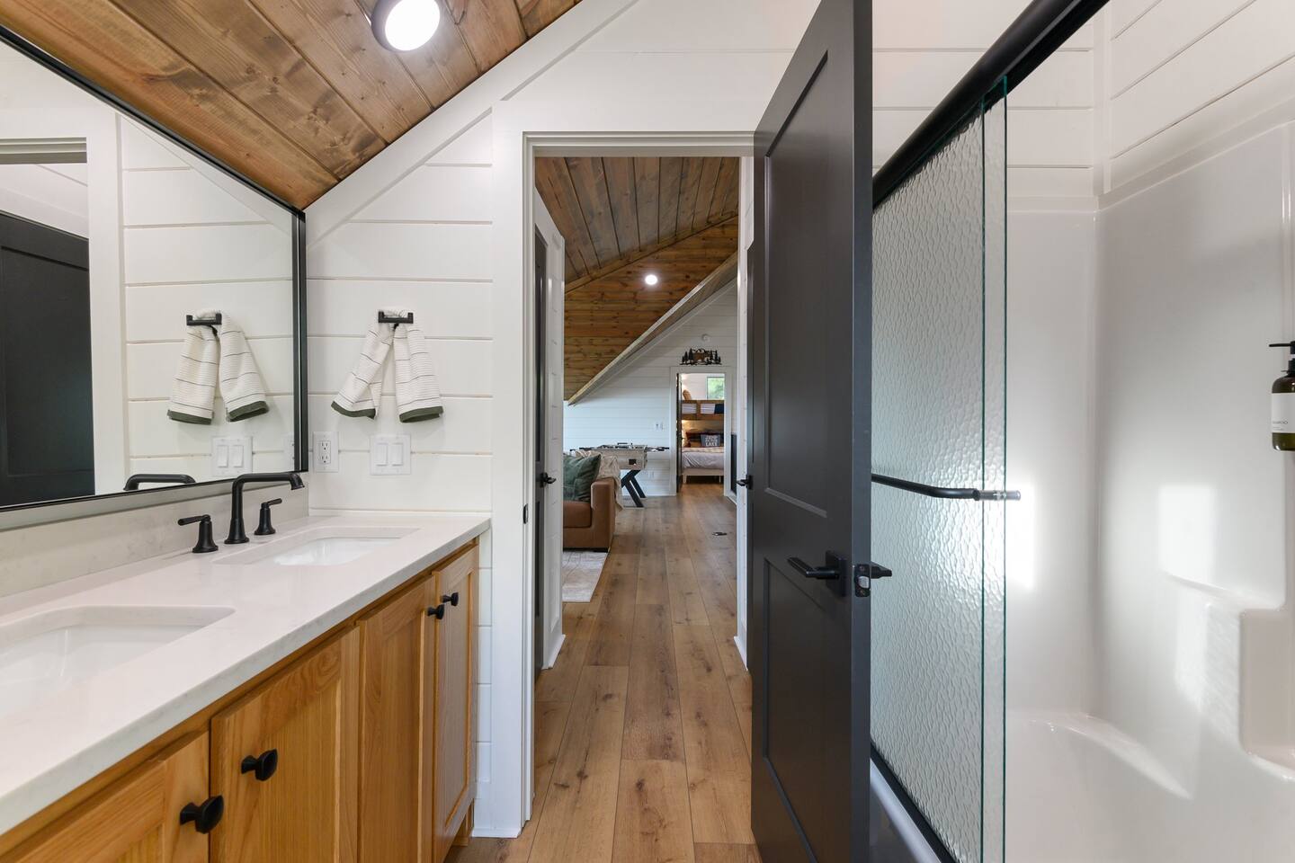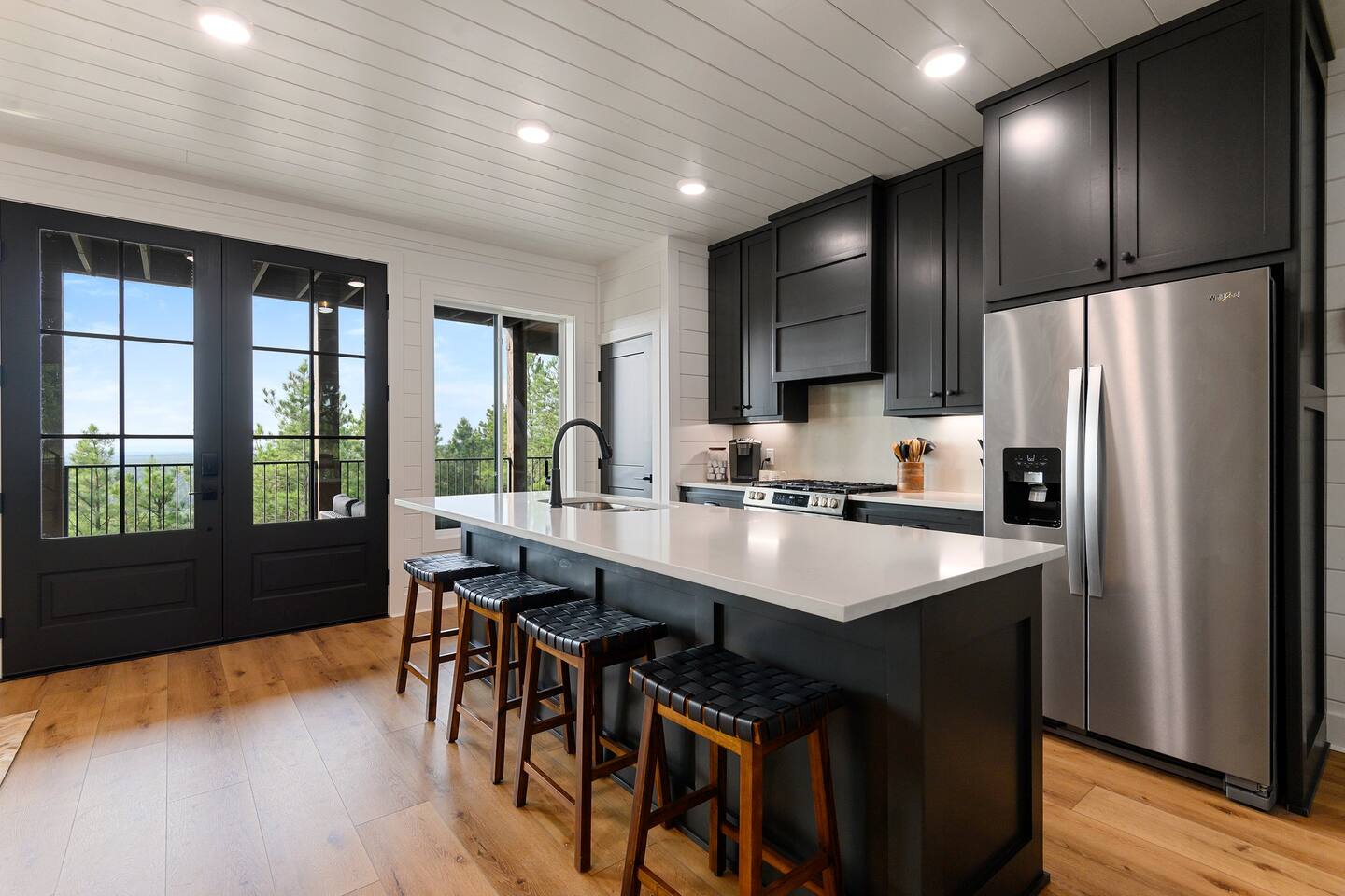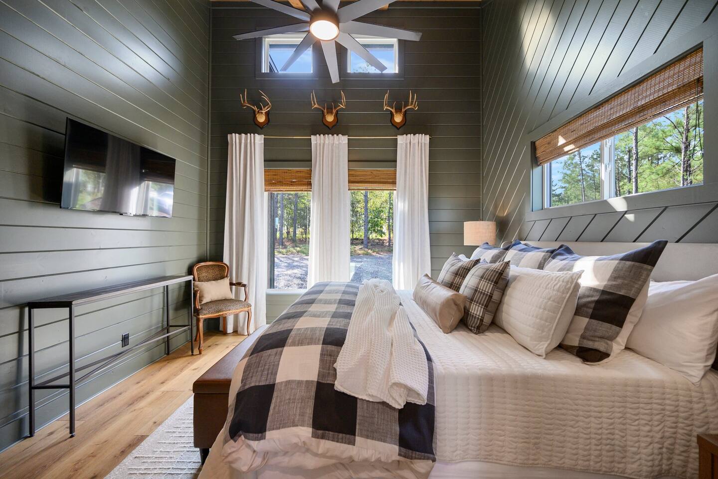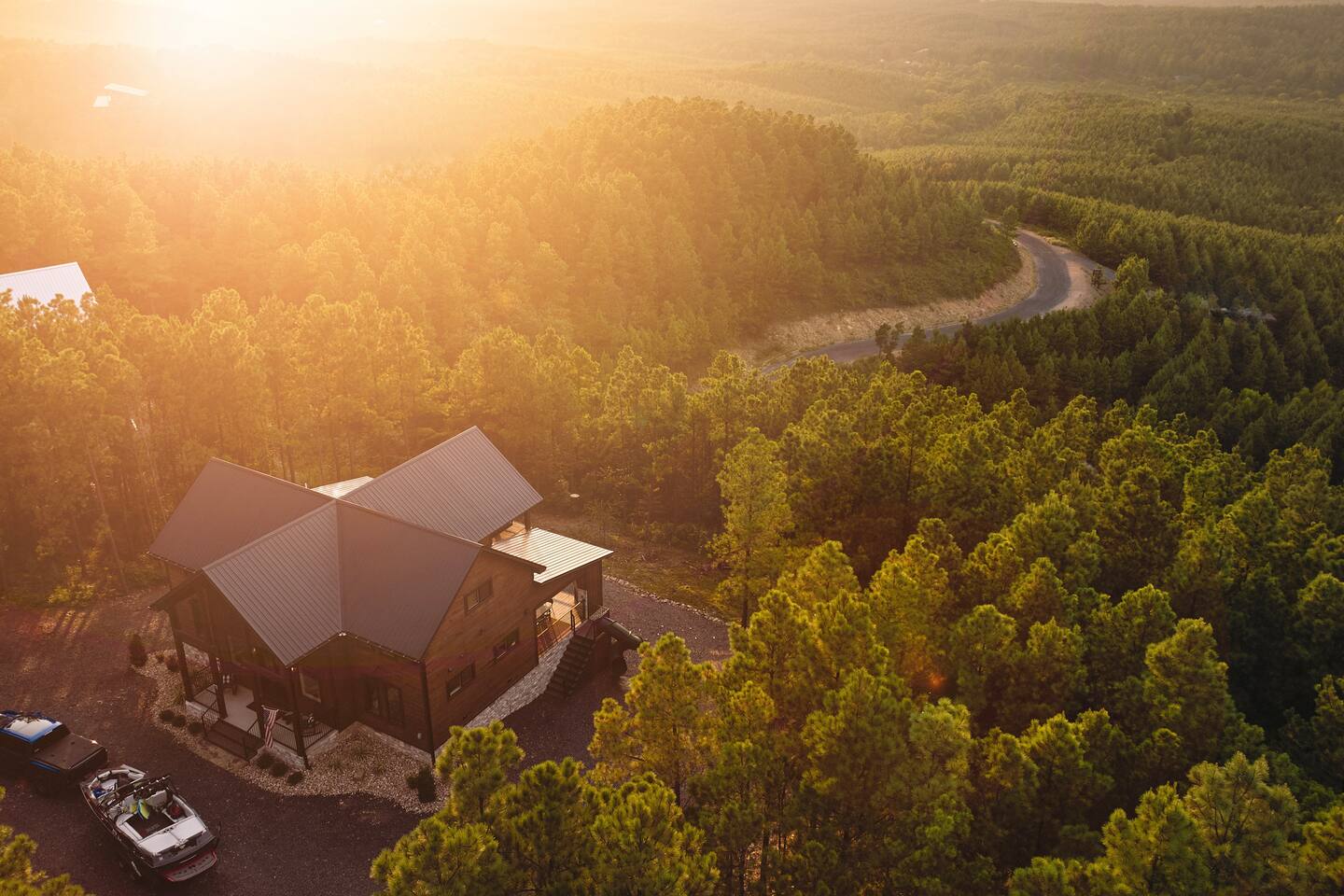 SLEEPING ACCOMODATIONS MAIN LEVEL: KING SUITE #1 •Luxury king bed with memory foam mattress and topper •400 count sheets with several pillow options •Two nightstands with lamps •6-speed ceiling fan with light •50” Roku Smart TV •Barn door offers privacy for a luxury glass enclosed wet room with large soaking tub •Wet room includes large shower with double shower heads, handheld sprayer & teak bench •72” vanity with double sinks, Quartz countertops and full mirror •Luxury bath linens and make-up cloths •Wardrobe valet with hanging rack for storage •Direct access to deck, outdoor fireplace & hot tub with gorgeous mountain views KING SUITE #2 •Luxury king bed with memory foam mattress and topper •400 count sheets with several pillow options •Two nightstands with lamps •6-speed ceiling fan with light •50” Roku Smart TV •Barn door privacy for walk in shower, shower head plus handheld sprayer & teak bench •65” vanity with double sinks with Quartz countertops and full mirror •Luxury bath linens and make-up cloths •Wardrobe valet with hanging rack for storage •Direct access to deck, hot tub and outdoor fireplace with spectacular mountain views UPSTAIRS BUNK ROOM AND FULL BATHROOM •2 queen memory foam beds with wall reading lights and USB chargers •2 twin memory foam bunk beds with stairway access and reading lights /USB chargers •50” Roku Smart TV •6-speed ceiling fan with light •70” loveseat •60” vanity with double sinks, Quartz countertops and full mirror •Tub/shower combination with glass enclosure •Wardrobe valet with hanging rack for storage COMMON AREAS: FAMILY ROOM •Floor to ceiling stone fireplace with gas logs •Stunning Vaulted Ceilings •55” Roku Smart TV •Large 6-speed ceiling fan •Spacious living area with a sofa, loveseat, two swivel chairs and two ottomans •Coffee table includes local interest books •Cabinet with games, books and puzzles •Chair and footstool under stairs for additional seating DINING ROOM AND KITCHEN •Large windows and doors provide relaxing mountain views for family dining experiences •Large rectangular wooden table with seating for 8 •Island bar area with seating for 4 guests •Deluxe 5 burner gas range •Deluxe refrigerator with water and ice in the door •Keurig K-Duo coffee maker with K-Cup and drip coffee pot. Includes 6 K-cups and ground coffee •Insta-pot/crockpot, toaster, blender and microwave •Dinnerware, glassware and silverware for 12 •3 serving platters and 2 serving bowls •Full array of bakeware, cookware and utensils including cutting boards and strainers •Kitchen towels, potholders, and hot pads/trivets •Full size stacked front load washer and dryer in laundry closet includes 5 laundry pods, broom, mop, dustpan, iron and small ironing board. UPSTAIRS LOFT GAMEROOM AREA •Large windows and doors provide majestic mountain views •Large 6-speed ceiling fan •Sofa, accent chair, coffee table and 50” Roku TV •Foosball table •2 Swivel chairs with ottomans to enjoy the view! •Cabinet with additional games, children’s books and puzzles OUTDOOR LIVING ON MAIN DECK •Expansive covered deck on main level •7-person deluxe HotSpring hot tub with 40 jets and LED lights for ultimate relaxation •Stone fireplace with gas logs •Two 50” Roku Smart TV’s and two 6-speed ceiling fans •Outdoor ambient string lighting on deck and connecting to firepit •Napoleon 4 burner BBQ gas grill with shelves and grill utensils •Outdoor patio table with seating for 8 •Sectional sofa and 2 club chairs •Wicker bar with two barstools and towels conveniently located near hot tub •Access to firepit area from deck stairs with child safety gate •Slide from main level deck to firepit with child safety gate on deck UPPER DECK •Majestic mountain view for watching sunrises and sunsets •Luxury daybed with lots of comfy pillows enhances stunning sunset views •6-speed ceiling fan •Table and 2 chairs for a workstation with a view or for games and puzzles, etc •Workout basket including yoga mat, foam roller & 5 lb. dumbbells for a workout with a view OUTDOOR ACTIVITY AREA •Stone firepit with six Adirondack chairs surrounded by ambient string lights •Perfect for s’mores, stories and stargazing loaded with fun family bonding and laughter •Firepit includes 5 posts with relaxing 60” swing, 2 saucer swings and hammock •Fully enclosed slide from back deck to firepit area •Outdoor cornhole game FRONT PORCH •Two step front entrance with handrails for easy unloading and loading •Front double doors provide your first glimpse of Mountain Ridge Retreat •Front porch with two comfortable rocking chairs for relaxing and enjoying the cabin •EV outlet available (Bring your own charger) •Ample parking in circle driveway for up to 5 vehicles and boat trailer parking Our cabin is professionally designed by KariLynn Interiors based out of Austin, TX.