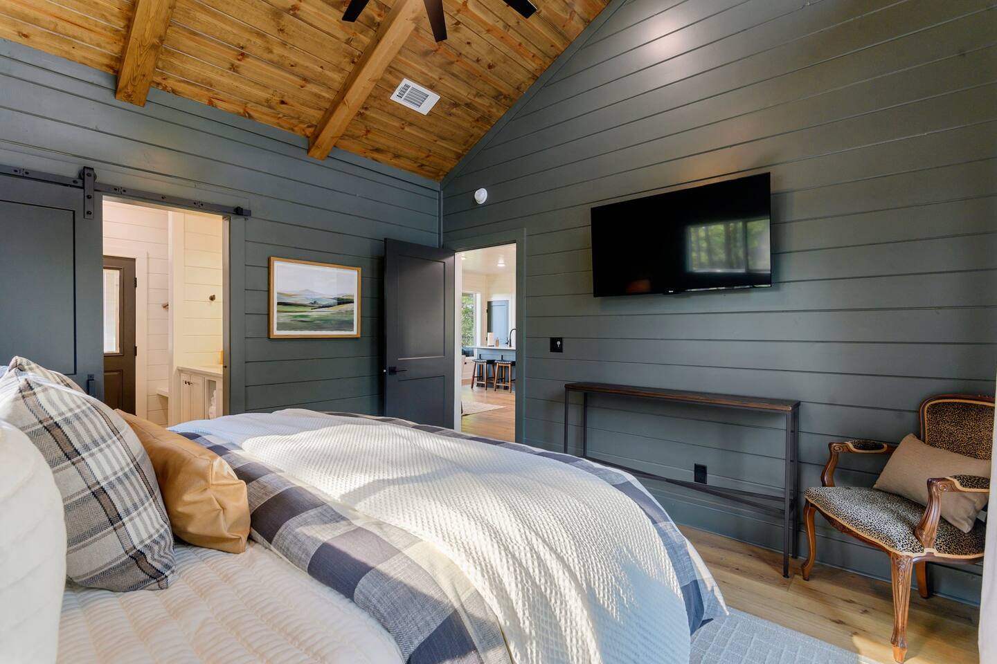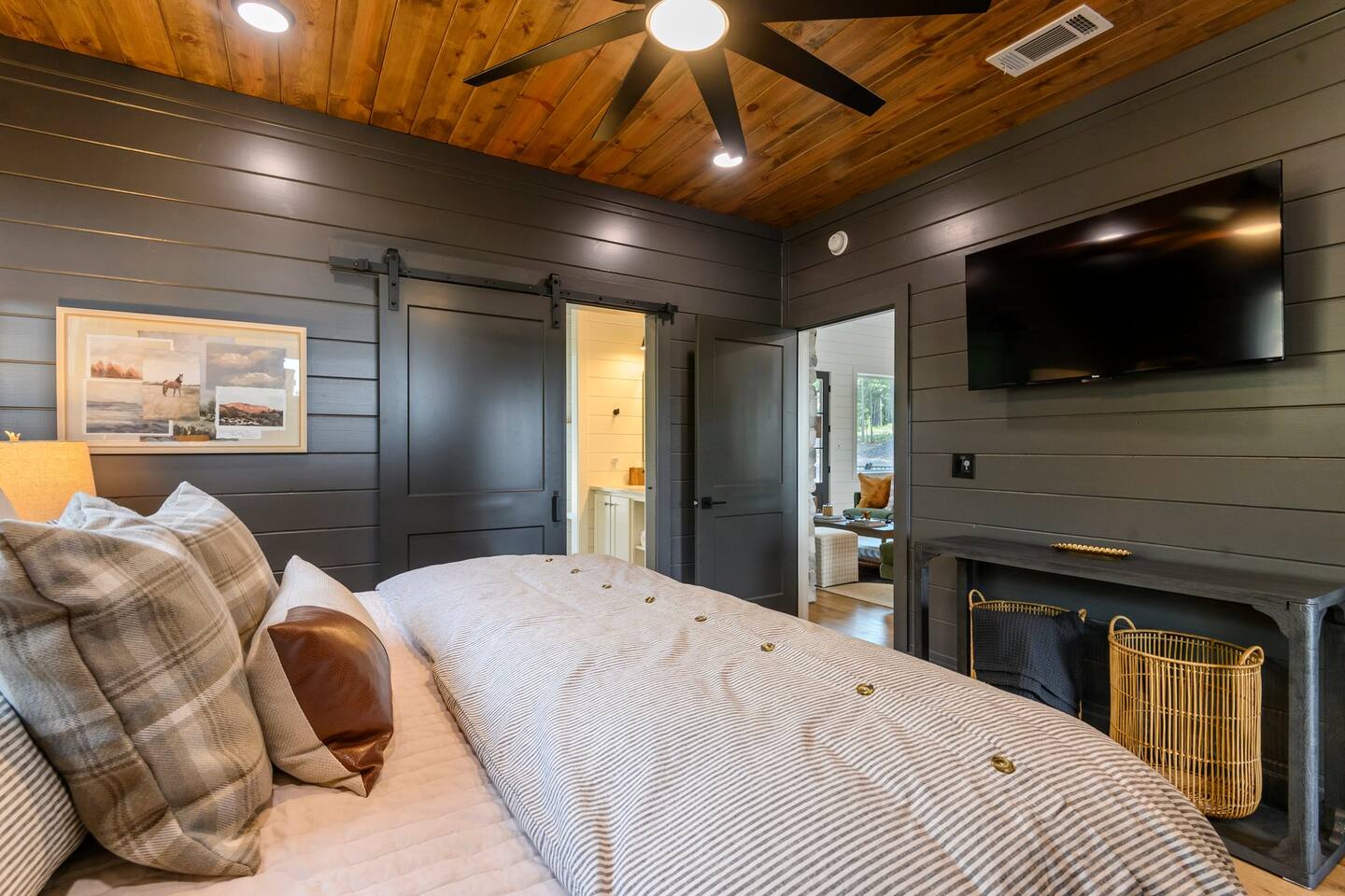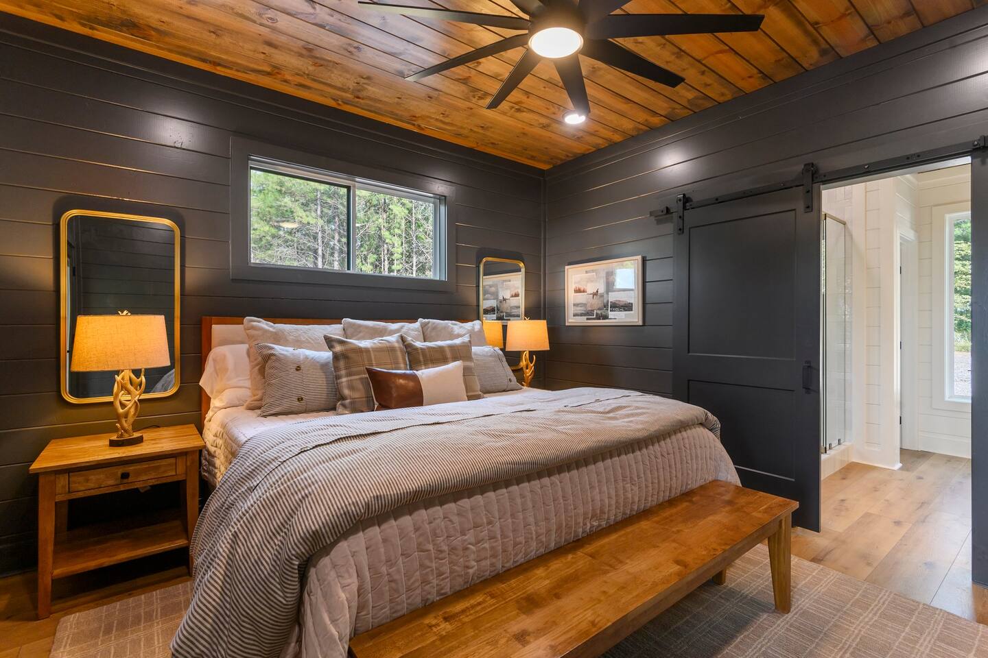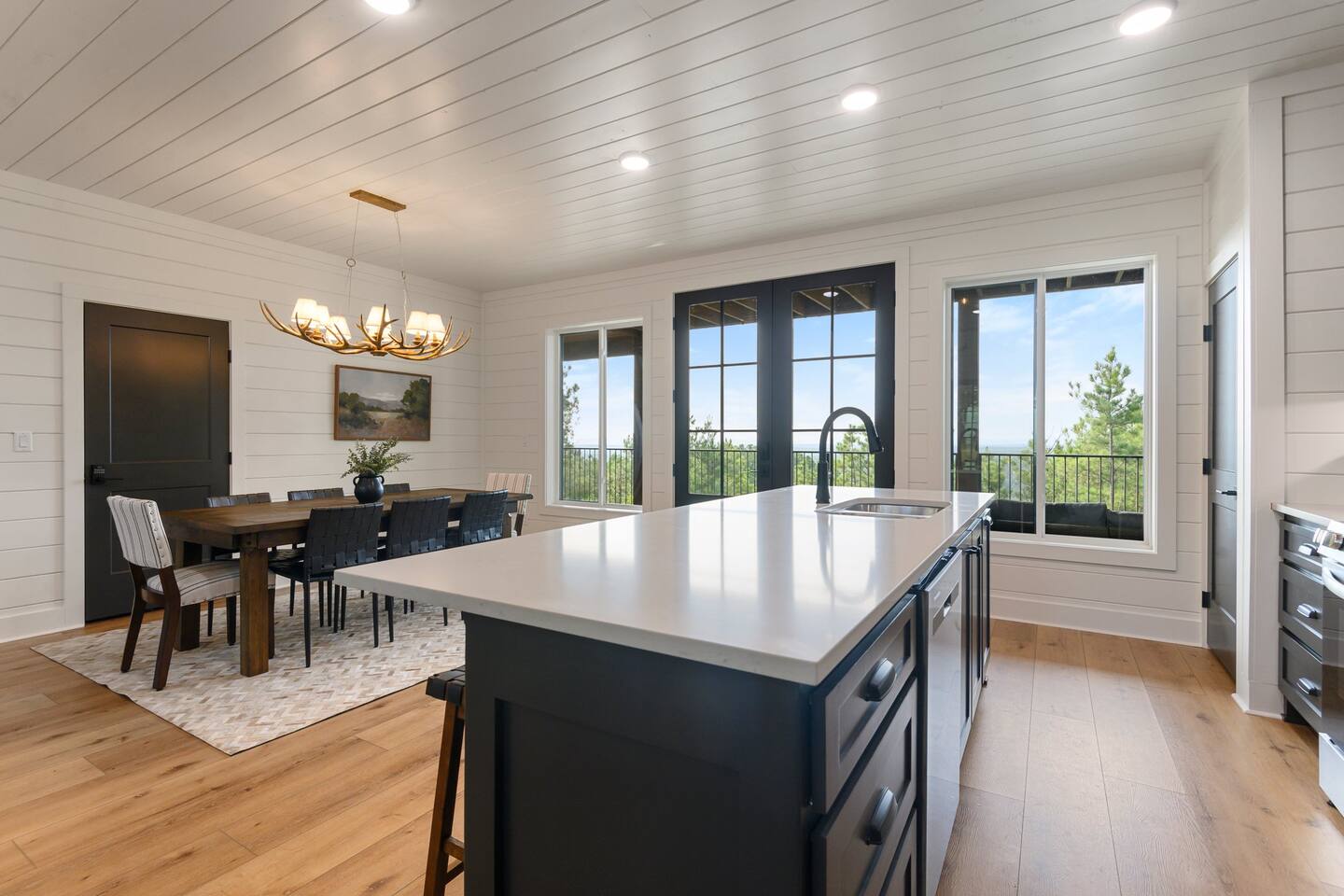 SLEEPING ACCOMODATIONS MAIN LEVEL: KING SUITE #1 •Luxury king bed with memory foam mattress and topper •400 count sheets with several pillow options •Two nightstands with lamps •6-speed ceiling fan with light •50” Roku Smart TV •Barn door offers privacy for a luxury glass enclosed wet room with large soaking tub •Wet room includes large shower with double shower heads, handheld sprayer & teak bench •72” vanity with double sinks, Quartz countertops and full mirror •Luxury bath linens and make-up cloths •Wardrobe valet with hanging rack for storage •Direct access to deck, outdoor fireplace & hot tub with gorgeous mountain views KING SUITE #2 •Luxury king bed with memory foam mattress and topper •400 count sheets with several pillow options •Two nightstands with lamps •6-speed ceiling fan with light •50” Roku Smart TV •Barn door privacy for walk in shower, shower head plus handheld sprayer & teak bench •65” vanity with double sinks with Quartz countertops and full mirror •Luxury bath linens and make-up cloths •Wardrobe valet with hanging rack for storage •Direct access to deck, hot tub and outdoor fireplace with spectacular mountain views UPSTAIRS BUNK ROOM AND FULL BATHROOM •2 queen memory foam beds with wall reading lights and USB chargers •2 twin memory foam bunk beds with stairway access and reading lights /USB chargers •50” Roku Smart TV •6-speed ceiling fan with light •70” loveseat •60” vanity with double sinks, Quartz countertops and full mirror •Tub/shower combination with glass enclosure •Wardrobe valet with hanging rack for storage COMMON AREAS: FAMILY ROOM •Floor to ceiling stone fireplace with gas logs •Stunning Vaulted Ceilings •55” Roku Smart TV •Large 6-speed ceiling fan •Spacious living area with a sofa, loveseat, two swivel chairs and two ottomans •Coffee table includes local interest books •Cabinet with games, books and puzzles •Chair and footstool under stairs for additional seating DINING ROOM AND KITCHEN •Large windows and doors provide relaxing mountain views for family dining experiences •Large rectangular wooden table with seating for 8 •Island bar area with seating for 4 guests •Deluxe 5 burner gas range •Deluxe refrigerator with water and ice in the door •Keurig K-Duo coffee maker with K-Cup and drip coffee pot. Includes 6 K-cups and ground coffee •Insta-pot/crockpot, toaster, blender and microwave •Dinnerware, glassware and silverware for 12 •3 serving platters and 2 serving bowls •Full array of bakeware, cookware and utensils including cutting boards and strainers •Kitchen towels, potholders, and hot pads/trivets •Full size stacked front load washer and dryer in laundry closet includes 5 laundry pods, broom, mop, dustpan, iron and small ironing board. UPSTAIRS LOFT GAMEROOM AREA •Large windows and doors provide majestic mountain views •Large 6-speed ceiling fan •Sofa, accent chair, coffee table and 50” Roku TV •Foosball table •2 Swivel chairs with ottomans to enjoy the view! •Cabinet with additional games, children’s books and puzzles OUTDOOR LIVING ON MAIN DECK •Expansive covered deck on main level •7-person deluxe HotSpring hot tub with 40 jets and LED lights for ultimate relaxation •Stone fireplace with gas logs •Two 50” Roku Smart TV’s and two 6-speed ceiling fans •Outdoor ambient string lighting on deck and connecting to firepit •Napoleon 4 burner BBQ gas grill with shelves and grill utensils •Outdoor patio table with seating for 8 •Sectional sofa and 2 club chairs •Wicker bar with two barstools and towels conveniently located near hot tub •Access to firepit area from deck stairs with child safety gate •Slide from main level deck to firepit with child safety gate on deck UPPER DECK •Majestic mountain view for watching sunrises and sunsets •Luxury daybed with lots of comfy pillows enhances stunning sunset views •6-speed ceiling fan •Table and 2 chairs for a workstation with a view or for games and puzzles, etc •Workout basket including yoga mat, foam roller & 5 lb. dumbbells for a workout with a view OUTDOOR ACTIVITY AREA •Stone firepit with six Adirondack chairs surrounded by ambient string lights •Perfect for s’mores, stories and stargazing loaded with fun family bonding and laughter •Firepit includes 5 posts with relaxing 60” swing, 2 saucer swings and hammock •Fully enclosed slide from back deck to firepit area •Outdoor cornhole game FRONT PORCH •Two step front entrance with handrails for easy unloading and loading •Front double doors provide your first glimpse of Mountain Ridge Retreat •Front porch with two comfortable rocking chairs for relaxing and enjoying the cabin •EV outlet available (Bring your own charger) •Ample parking in circle driveway for up to 5 vehicles and boat trailer parking Our cabin is professionally designed by KariLynn Interiors based out of Austin, TX.