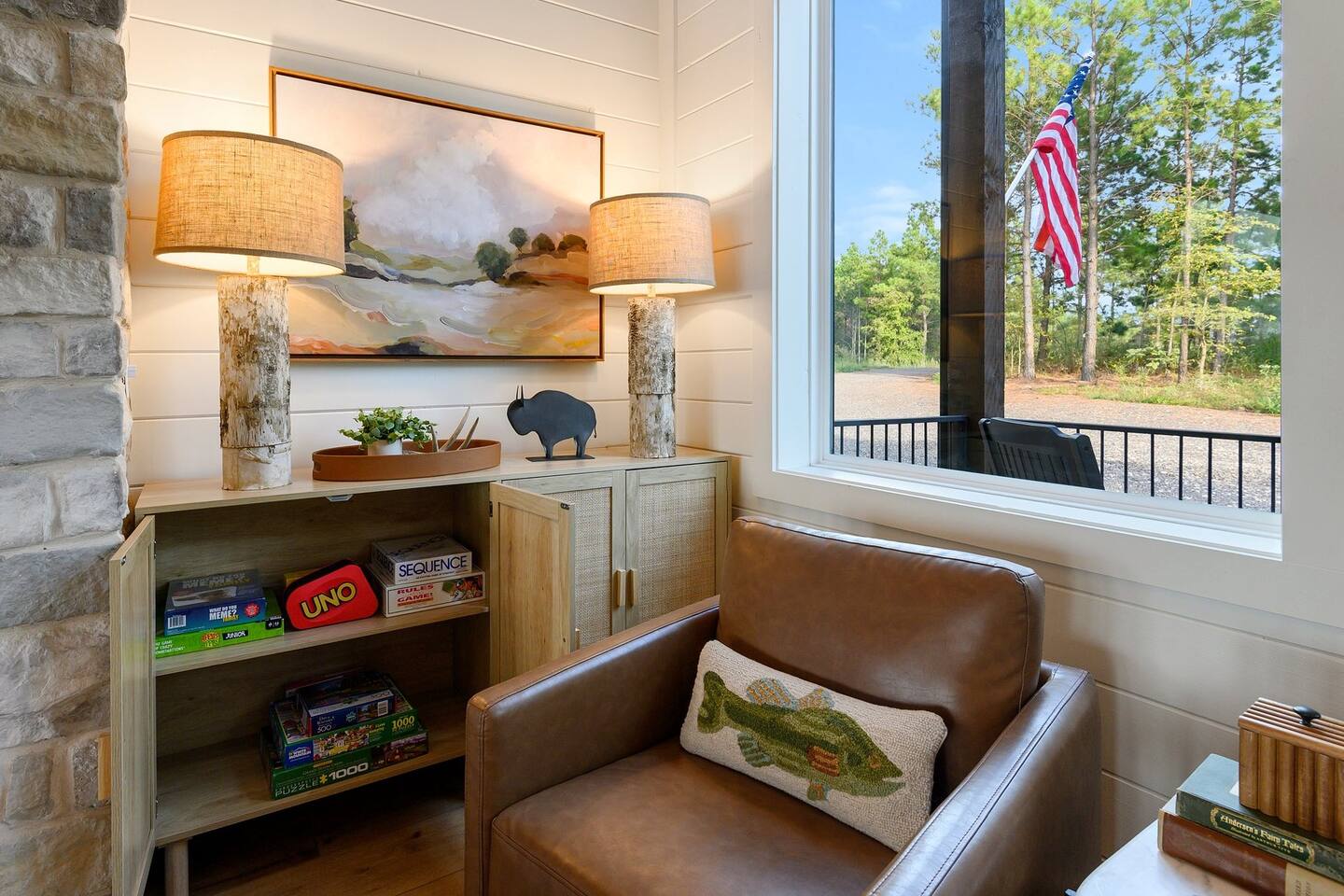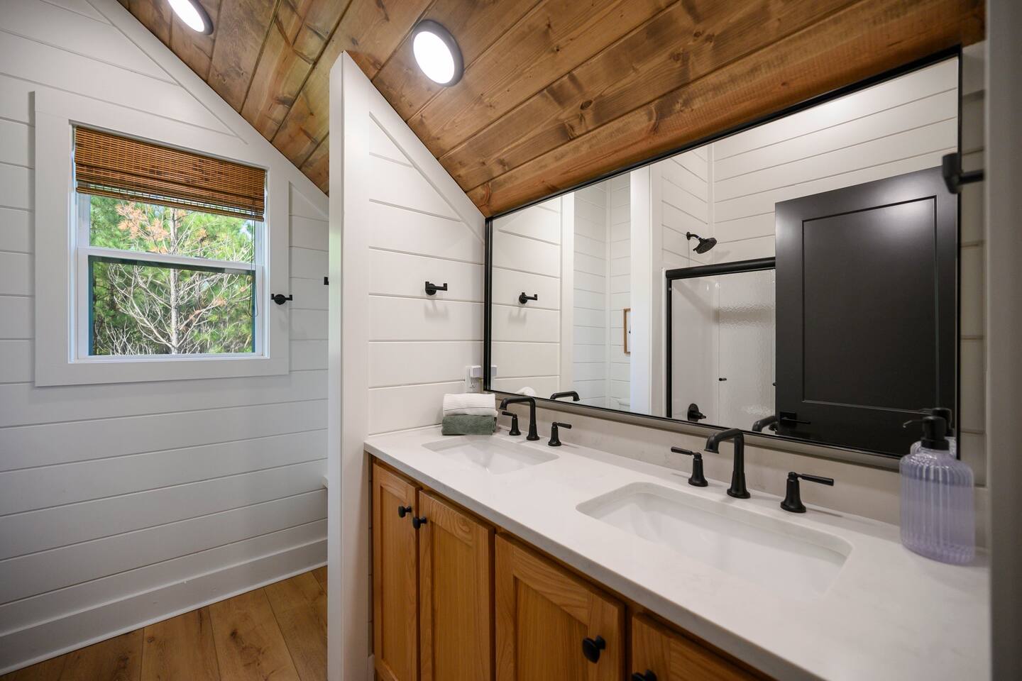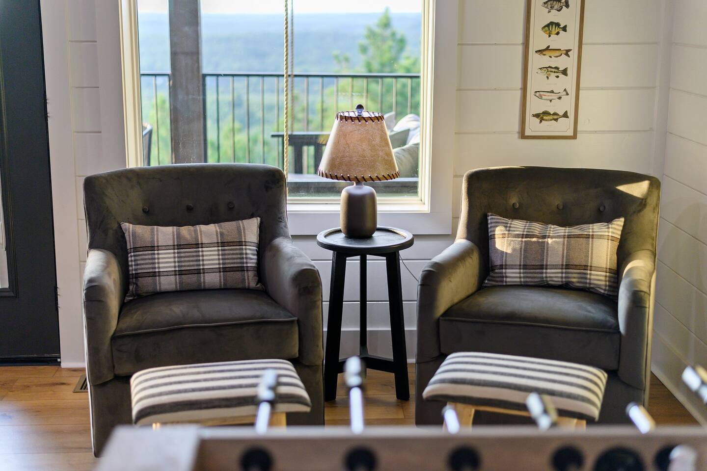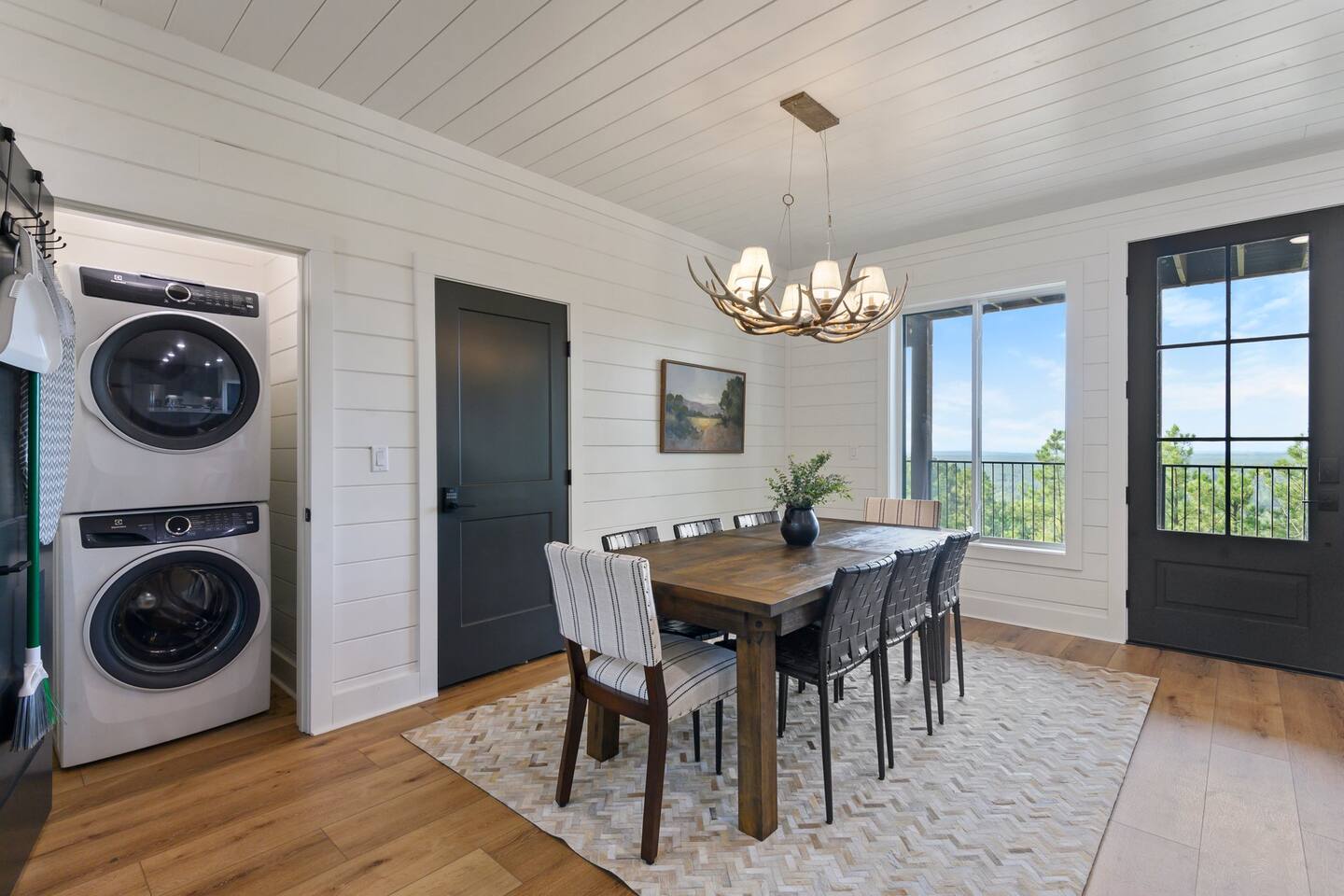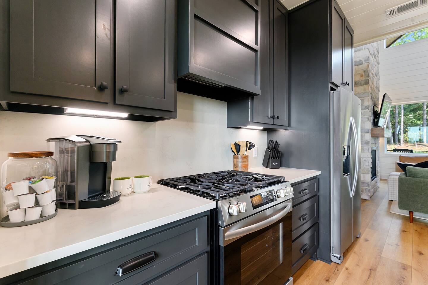 SLEEPING ACCOMODATIONS MAIN LEVEL: KING SUITE #1 •Luxury king bed with memory foam mattress and topper •400 count sheets with several pillow options •Two nightstands with lamps •6-speed ceiling fan with light •50” Roku Smart TV •Barn door offers privacy for a luxury glass enclosed wet room with large soaking tub •Wet room includes large shower with double shower heads, handheld sprayer & teak bench •72” vanity with double sinks, Quartz countertops and full mirror •Luxury bath linens and make-up cloths •Wardrobe valet with hanging rack for storage •Direct access to deck, outdoor fireplace & hot tub with gorgeous mountain views KING SUITE #2 •Luxury king bed with memory foam mattress and topper •400 count sheets with several pillow options •Two nightstands with lamps •6-speed ceiling fan with light •50” Roku Smart TV •Barn door privacy for walk in shower, shower head plus handheld sprayer & teak bench •65” vanity with double sinks with Quartz countertops and full mirror •Luxury bath linens and make-up cloths •Wardrobe valet with hanging rack for storage •Direct access to deck, hot tub and outdoor fireplace with spectacular mountain views UPSTAIRS BUNK ROOM AND FULL BATHROOM •2 queen memory foam beds with wall reading lights and USB chargers •2 twin memory foam bunk beds with stairway access and reading lights /USB chargers •50” Roku Smart TV •6-speed ceiling fan with light •70” loveseat •60” vanity with double sinks, Quartz countertops and full mirror •Tub/shower combination with glass enclosure •Wardrobe valet with hanging rack for storage COMMON AREAS: FAMILY ROOM •Floor to ceiling stone fireplace with gas logs •Stunning Vaulted Ceilings •55” Roku Smart TV •Large 6-speed ceiling fan •Spacious living area with a sofa, loveseat, two swivel chairs and two ottomans •Coffee table includes local interest books •Cabinet with games, books and puzzles •Chair and footstool under stairs for additional seating DINING ROOM AND KITCHEN •Large windows and doors provide relaxing mountain views for family dining experiences •Large rectangular wooden table with seating for 8 •Island bar area with seating for 4 guests •Deluxe 5 burner gas range •Deluxe refrigerator with water and ice in the door •Keurig K-Duo coffee maker with K-Cup and drip coffee pot. Includes 6 K-cups and ground coffee •Insta-pot/crockpot, toaster, blender and microwave •Dinnerware, glassware and silverware for 12 •3 serving platters and 2 serving bowls •Full array of bakeware, cookware and utensils including cutting boards and strainers •Kitchen towels, potholders, and hot pads/trivets •Full size stacked front load washer and dryer in laundry closet includes 5 laundry pods, broom, mop, dustpan, iron and small ironing board. UPSTAIRS LOFT GAMEROOM AREA •Large windows and doors provide majestic mountain views •Large 6-speed ceiling fan •Sofa, accent chair, coffee table and 50” Roku TV •Foosball table •2 Swivel chairs with ottomans to enjoy the view! •Cabinet with additional games, children’s books and puzzles OUTDOOR LIVING ON MAIN DECK •Expansive covered deck on main level •7-person deluxe HotSpring hot tub with 40 jets and LED lights for ultimate relaxation •Stone fireplace with gas logs •Two 50” Roku Smart TV’s and two 6-speed ceiling fans •Outdoor ambient string lighting on deck and connecting to firepit •Napoleon 4 burner BBQ gas grill with shelves and grill utensils •Outdoor patio table with seating for 8 •Sectional sofa and 2 club chairs •Wicker bar with two barstools and towels conveniently located near hot tub •Access to firepit area from deck stairs with child safety gate •Slide from main level deck to firepit with child safety gate on deck UPPER DECK •Majestic mountain view for watching sunrises and sunsets •Luxury daybed with lots of comfy pillows enhances stunning sunset views •6-speed ceiling fan •Table and 2 chairs for a workstation with a view or for games and puzzles, etc •Workout basket including yoga mat, foam roller & 5 lb. dumbbells for a workout with a view OUTDOOR ACTIVITY AREA •Stone firepit with six Adirondack chairs surrounded by ambient string lights •Perfect for s’mores, stories and stargazing loaded with fun family bonding and laughter •Firepit includes 5 posts with relaxing 60” swing, 2 saucer swings and hammock •Fully enclosed slide from back deck to firepit area •Outdoor cornhole game FRONT PORCH •Two step front entrance with handrails for easy unloading and loading •Front double doors provide your first glimpse of Mountain Ridge Retreat •Front porch with two comfortable rocking chairs for relaxing and enjoying the cabin •EV outlet available (Bring your own charger) •Ample parking in circle driveway for up to 5 vehicles and boat trailer parking Our cabin is professionally designed by KariLynn Interiors based out of Austin, TX.