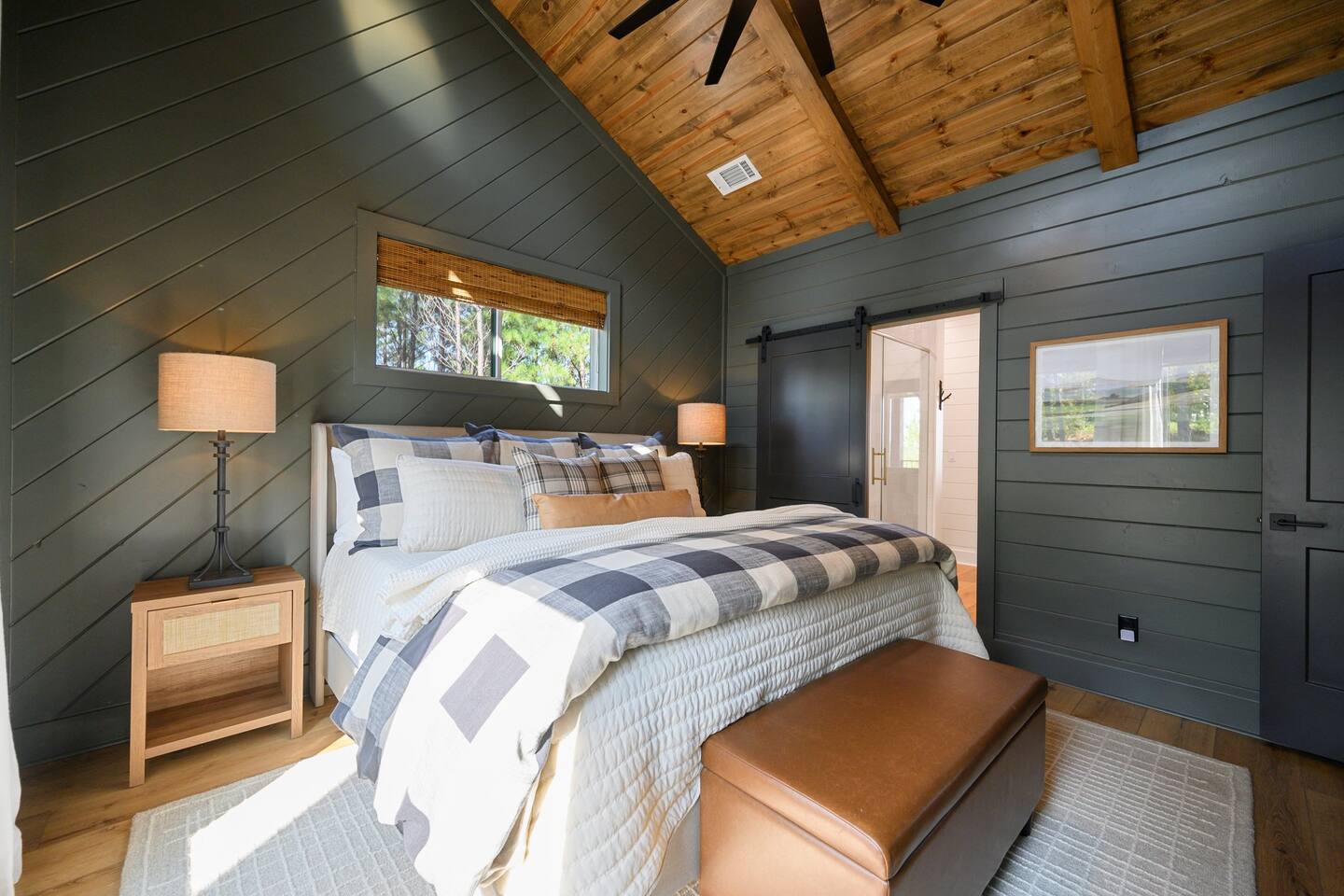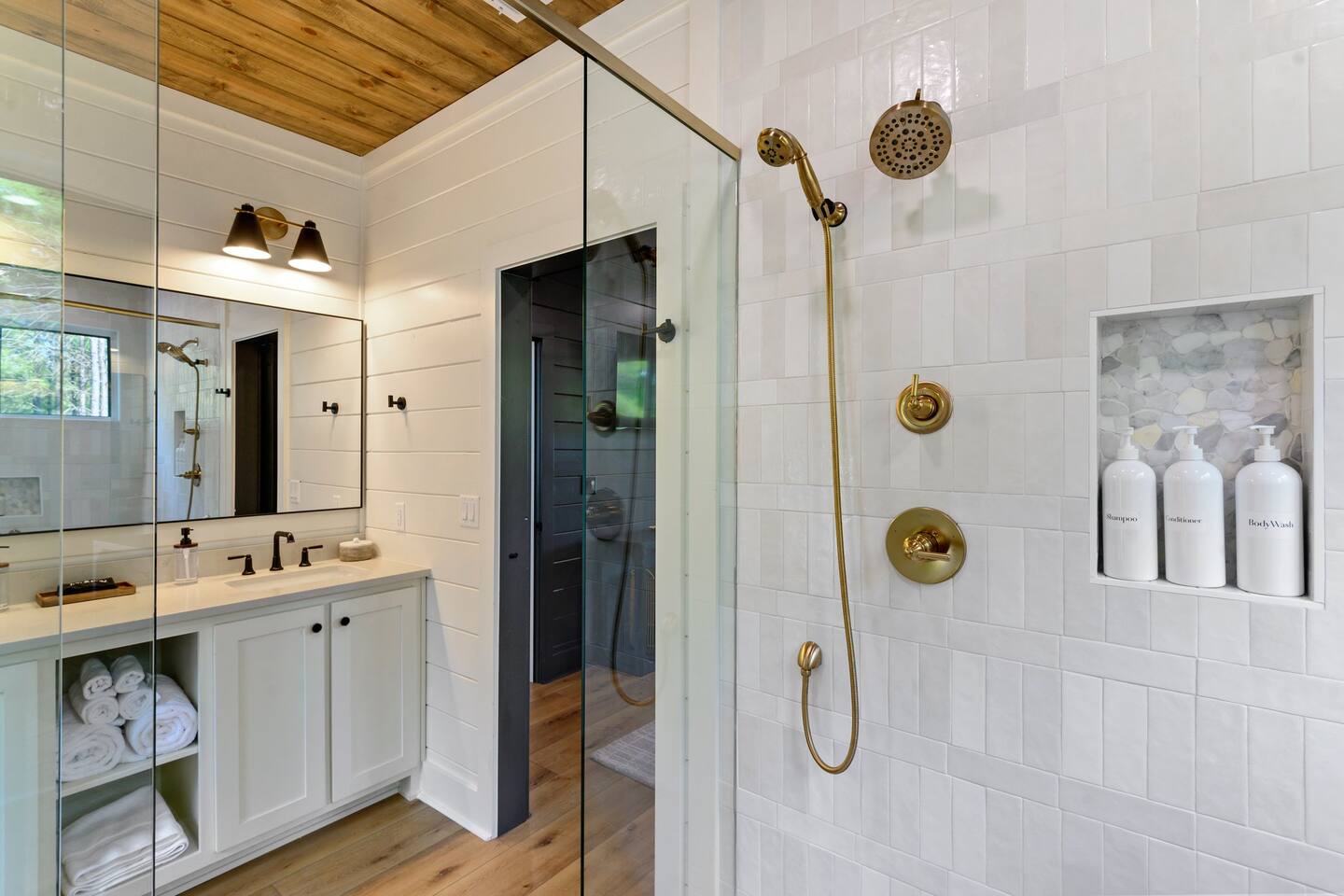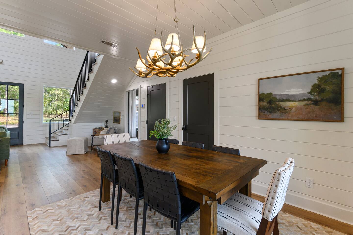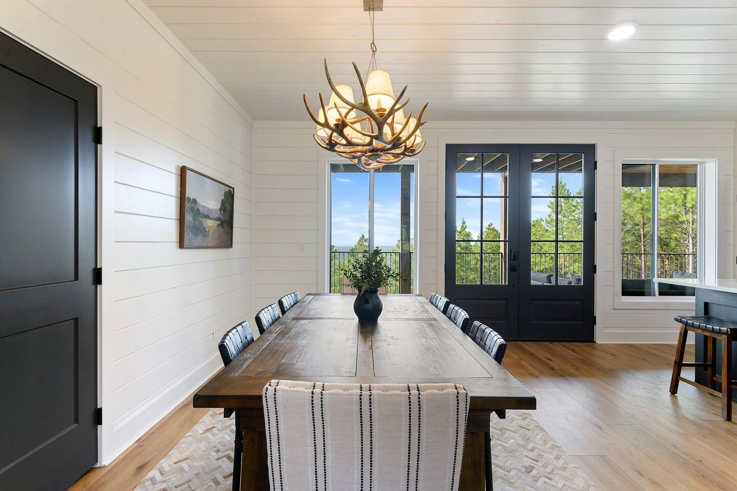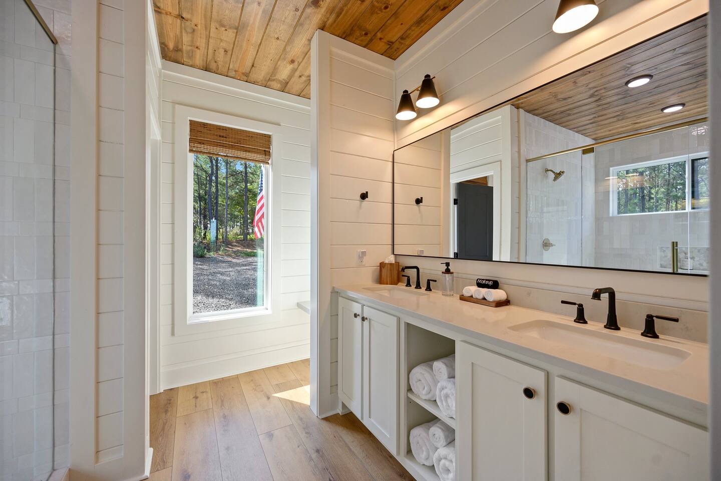 SLEEPING ACCOMODATIONS MAIN LEVEL: KING SUITE #1 •Luxury king bed with memory foam mattress and topper •400 count sheets with several pillow options •Two nightstands with lamps •6-speed ceiling fan with light •50” Roku Smart TV •Barn door offers privacy for a luxury glass enclosed wet room with large soaking tub •Wet room includes large shower with double shower heads, handheld sprayer & teak bench •72” vanity with double sinks, Quartz countertops and full mirror •Luxury bath linens and make-up cloths •Wardrobe valet with hanging rack for storage •Direct access to deck, outdoor fireplace & hot tub with gorgeous mountain views KING SUITE #2 •Luxury king bed with memory foam mattress and topper •400 count sheets with several pillow options •Two nightstands with lamps •6-speed ceiling fan with light •50” Roku Smart TV •Barn door privacy for walk in shower, shower head plus handheld sprayer & teak bench •65” vanity with double sinks with Quartz countertops and full mirror •Luxury bath linens and make-up cloths •Wardrobe valet with hanging rack for storage •Direct access to deck, hot tub and outdoor fireplace with spectacular mountain views UPSTAIRS BUNK ROOM AND FULL BATHROOM •2 queen memory foam beds with wall reading lights and USB chargers •2 twin memory foam bunk beds with stairway access and reading lights /USB chargers •50” Roku Smart TV •6-speed ceiling fan with light •70” loveseat •60” vanity with double sinks, Quartz countertops and full mirror •Tub/shower combination with glass enclosure •Wardrobe valet with hanging rack for storage COMMON AREAS: FAMILY ROOM •Floor to ceiling stone fireplace with gas logs •Stunning Vaulted Ceilings •55” Roku Smart TV •Large 6-speed ceiling fan •Spacious living area with a sofa, loveseat, two swivel chairs and two ottomans •Coffee table includes local interest books •Cabinet with games, books and puzzles •Chair and footstool under stairs for additional seating DINING ROOM AND KITCHEN •Large windows and doors provide relaxing mountain views for family dining experiences •Large rectangular wooden table with seating for 8 •Island bar area with seating for 4 guests •Deluxe 5 burner gas range •Deluxe refrigerator with water and ice in the door •Keurig K-Duo coffee maker with K-Cup and drip coffee pot. Includes 6 K-cups and ground coffee •Insta-pot/crockpot, toaster, blender and microwave •Dinnerware, glassware and silverware for 12 •3 serving platters and 2 serving bowls •Full array of bakeware, cookware and utensils including cutting boards and strainers •Kitchen towels, potholders, and hot pads/trivets •Full size stacked front load washer and dryer in laundry closet includes 5 laundry pods, broom, mop, dustpan, iron and small ironing board. UPSTAIRS LOFT GAMEROOM AREA •Large windows and doors provide majestic mountain views •Large 6-speed ceiling fan •Sofa, accent chair, coffee table and 50” Roku TV •Foosball table •2 Swivel chairs with ottomans to enjoy the view! •Cabinet with additional games, children’s books and puzzles OUTDOOR LIVING ON MAIN DECK •Expansive covered deck on main level •7-person deluxe HotSpring hot tub with 40 jets and LED lights for ultimate relaxation •Stone fireplace with gas logs •Two 50” Roku Smart TV’s and two 6-speed ceiling fans •Outdoor ambient string lighting on deck and connecting to firepit •Napoleon 4 burner BBQ gas grill with shelves and grill utensils •Outdoor patio table with seating for 8 •Sectional sofa and 2 club chairs •Wicker bar with two barstools and towels conveniently located near hot tub •Access to firepit area from deck stairs with child safety gate •Slide from main level deck to firepit with child safety gate on deck UPPER DECK •Majestic mountain view for watching sunrises and sunsets •Luxury daybed with lots of comfy pillows enhances stunning sunset views •6-speed ceiling fan •Table and 2 chairs for a workstation with a view or for games and puzzles, etc •Workout basket including yoga mat, foam roller & 5 lb. dumbbells for a workout with a view OUTDOOR ACTIVITY AREA •Stone firepit with six Adirondack chairs surrounded by ambient string lights •Perfect for s’mores, stories and stargazing loaded with fun family bonding and laughter •Firepit includes 5 posts with relaxing 60” swing, 2 saucer swings and hammock •Fully enclosed slide from back deck to firepit area •Outdoor cornhole game FRONT PORCH •Two step front entrance with handrails for easy unloading and loading •Front double doors provide your first glimpse of Mountain Ridge Retreat •Front porch with two comfortable rocking chairs for relaxing and enjoying the cabin •EV outlet available (Bring your own charger) •Ample parking in circle driveway for up to 5 vehicles and boat trailer parking Our cabin is professionally designed by KariLynn Interiors based out of Austin, TX.